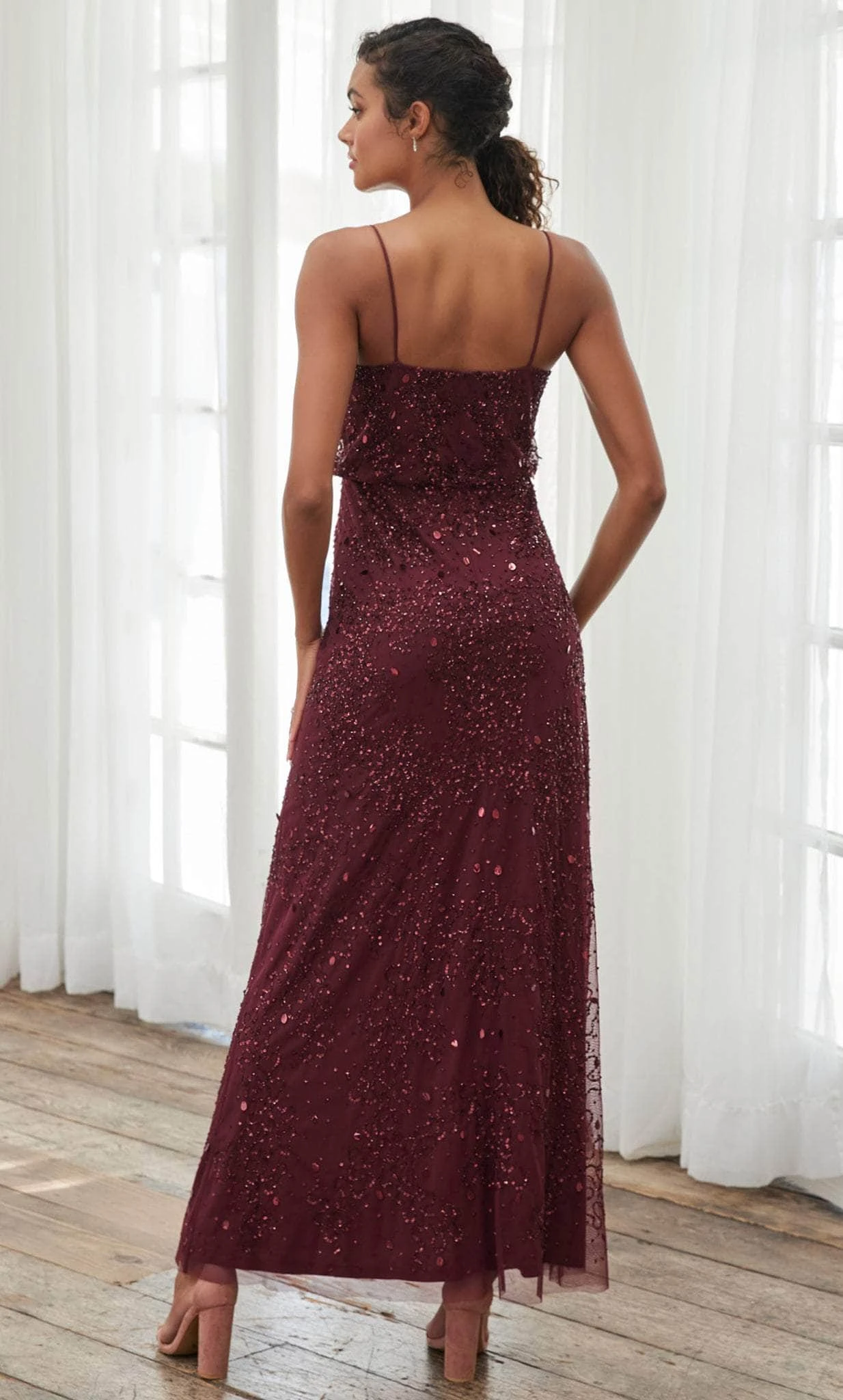 | Details: | Sleeveless, Spaghetti straps, Blouson, Sequins, Beads, Slit, Mid back, Full length |