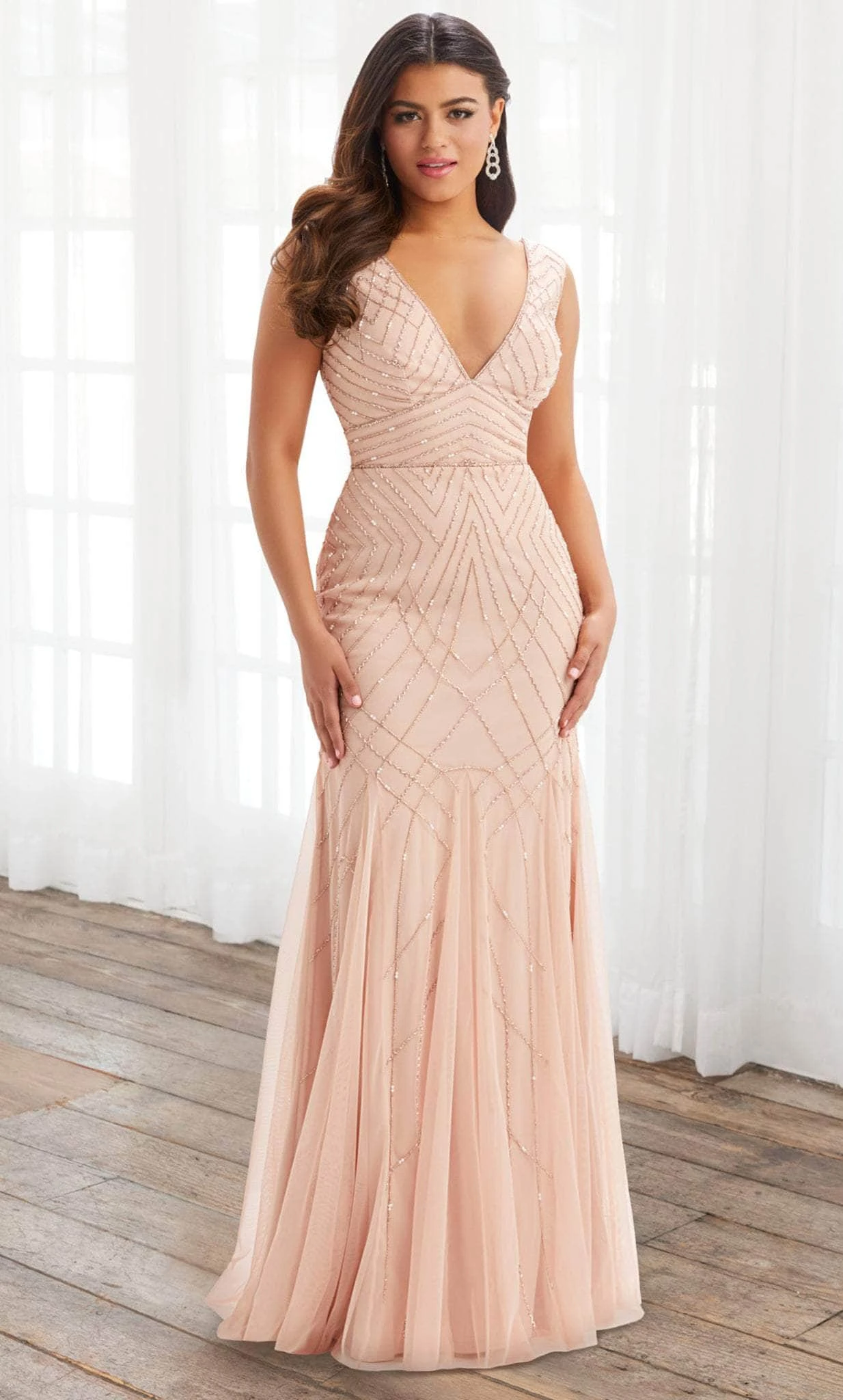 Make a memorable splash at your upscale evening in this lux formal gown by House of Wu 40392. Sparkle amongst the crown with the beaded embellishments that cover this full length gown in geometric patterns. A plunging V-neckline tapers into sleeveless shoulder straps, while the beaded patterns accentuate the curves. This dress clings to the figure, and flows out in a fit and flare style. Expect to be turning heads as you walk into your special event wearing this creatively romantic creation by House of Wu 40392. Models is wearing Blush color.