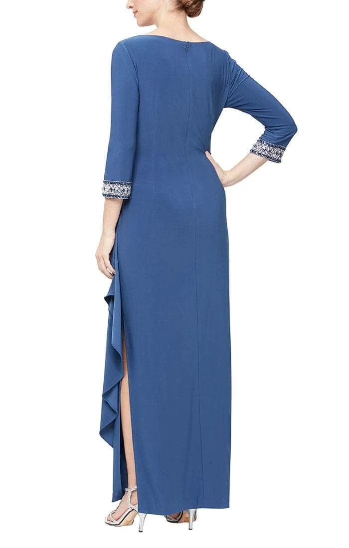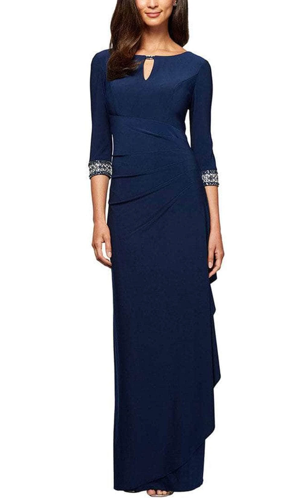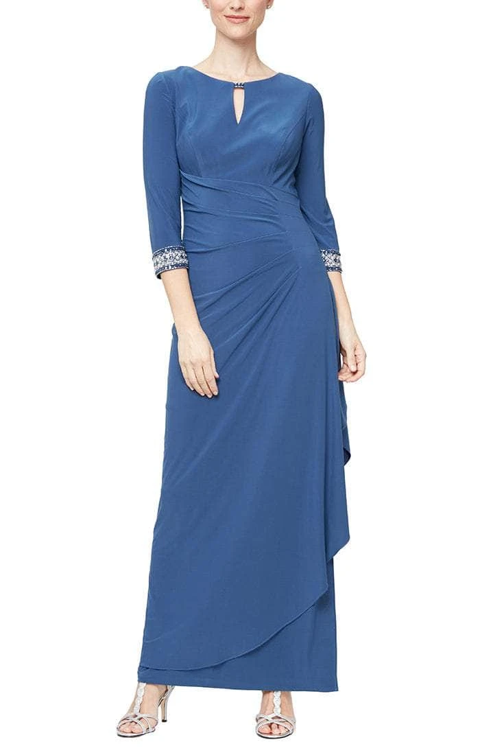 Aspire to exude dominance among the upscale crowd in this sweet Alex Evenings 1351416 creation. This ensemble is an absolute must-have for any mother of the bride or groom’s wardrobe. This piece is exquisitely fashioned in matte stretch fabric with beautiful beadwork on the sleeve hem and features a delicate jewel neckline with keyhole. The delicate A-line skirt is wrapped around the waist with gathered ruched and falls to a full-length hem. Wrap yourself in a purely stellar style at your next special affair with this Alex Evenings masterpiece Model is wearing Cobalt, and Plum colors.