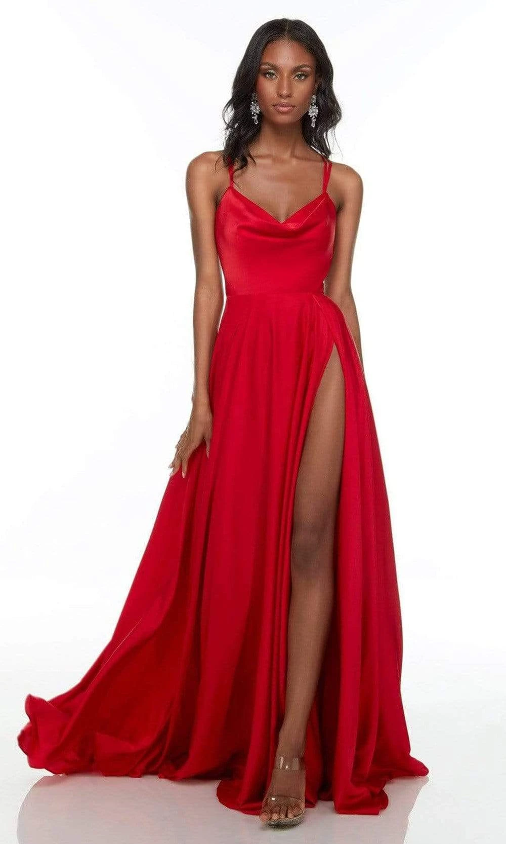 Grace the spectacular event with the flair of a stunner in this Alyce Paris 61139 creation. Rendered with a cowl neckline stringed with spaghetti straps, this gown also flaunts a strappy back with a cutout. The high slit graces the flaring silhouette as it falls into a train. Flatter those fantastic assets with this Alyce Paris masterpiece. Model is wearing the Red color. Find more Pageant Dresses.