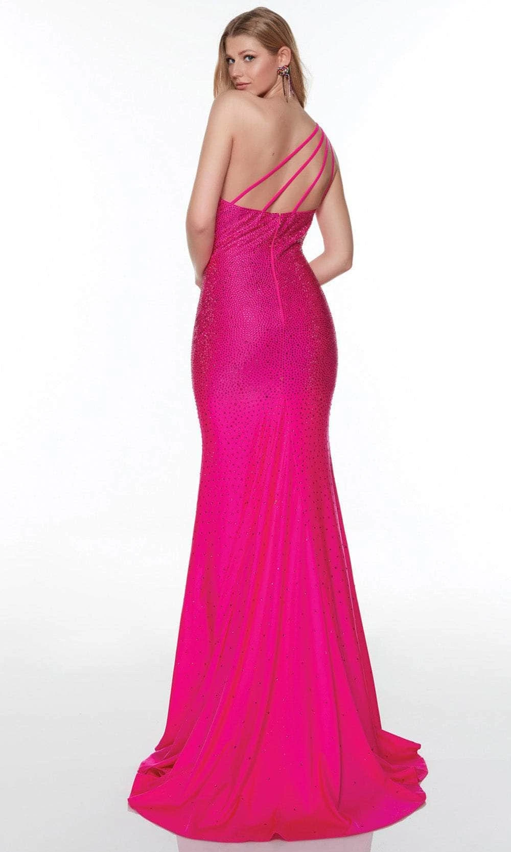 Flaunt an exceptional style that is gorgeously fascinating in this Alyce Paris 61253 masterpiece. This glamorous jersey dress is designed with beadwork sprinkled throughout the form-fitting bodice. It displays an asymmetric neckline and an open back with strappy slanted detail and zipper closure. The skirt gracefully cascades down to a full length sheath silhouette, finished off with a sweeping train for added drama. You are statuesque in a posed gown from Alyce Paris 61253. Models are wearing the Electric Fuchsia and Ice Lilac colors.