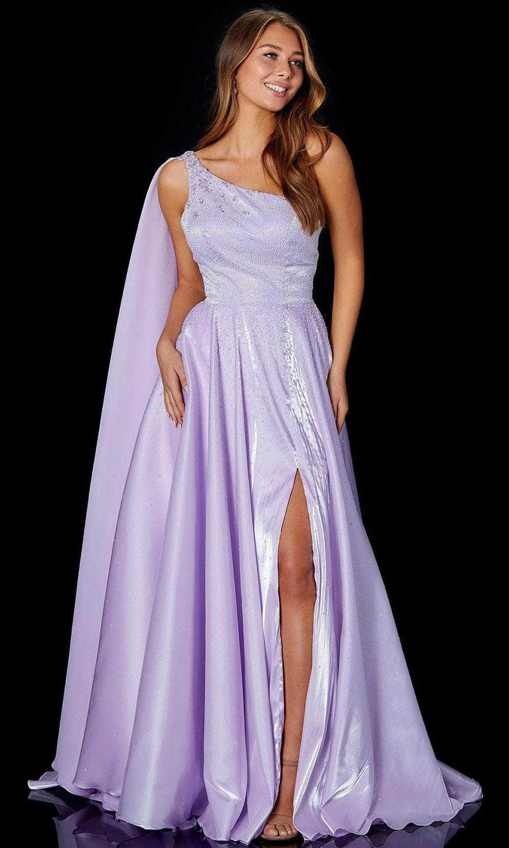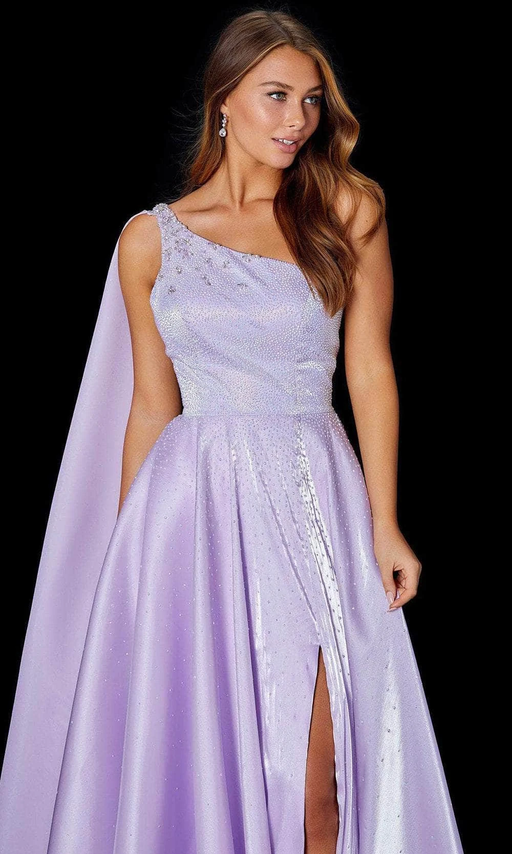 Make a memorable splash at your posh evening in this lovely evening dress by Amarra 87259. Stunning sparkling embellishments encrust the fitted bodice and elegantly scattered from waist down to the bottom of the ensemble. This stellar piece boasts a fitted bodice with an asymmetrical neckline, supported with a single shoulder strap and paired with equally embellished cape. Crisscross straps design the backless dress while the A-line skirt cascades gracefully to the floor and completed with a sweep train. Look your absolute best and create a night that you will forever reminisce with this Amarra design. Model is wearing Lilac color.