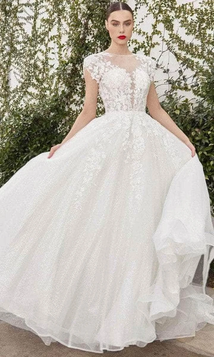 This wedding dress is perfectly awesome. It showcases a corset bodice ornamented with radiating floral applique and features a bateau neckline with cap sleeves that add on a more glamorous look and lace applique the torso tulle lace skirt. The extravaganza A-line tulle silhouette cascades below the waist and makes a dramatic exit to the floor in a full-length hem and a sweeping train. Model is wearing the Off White color.