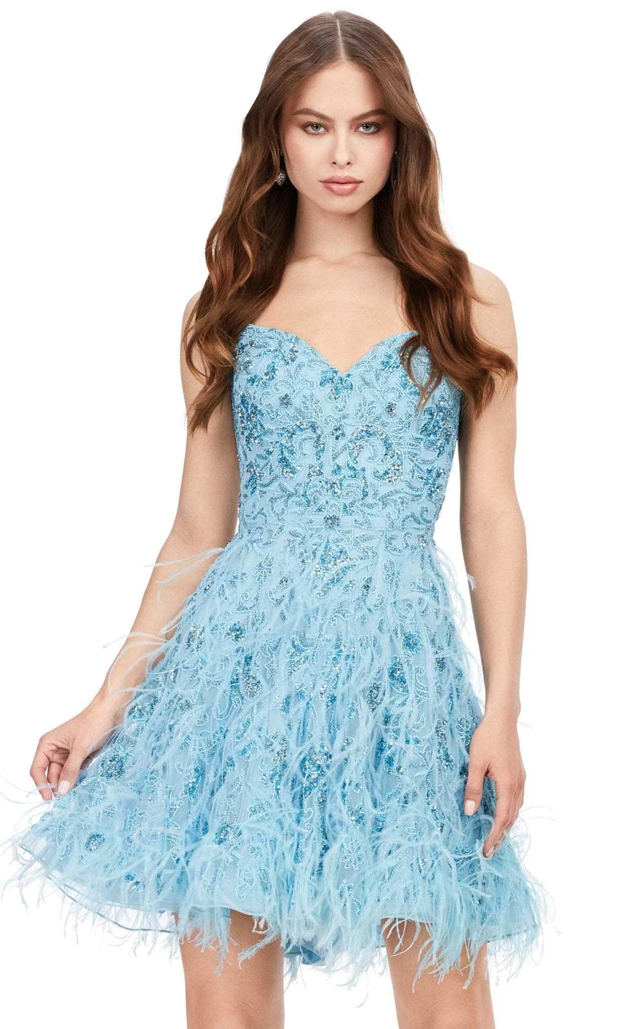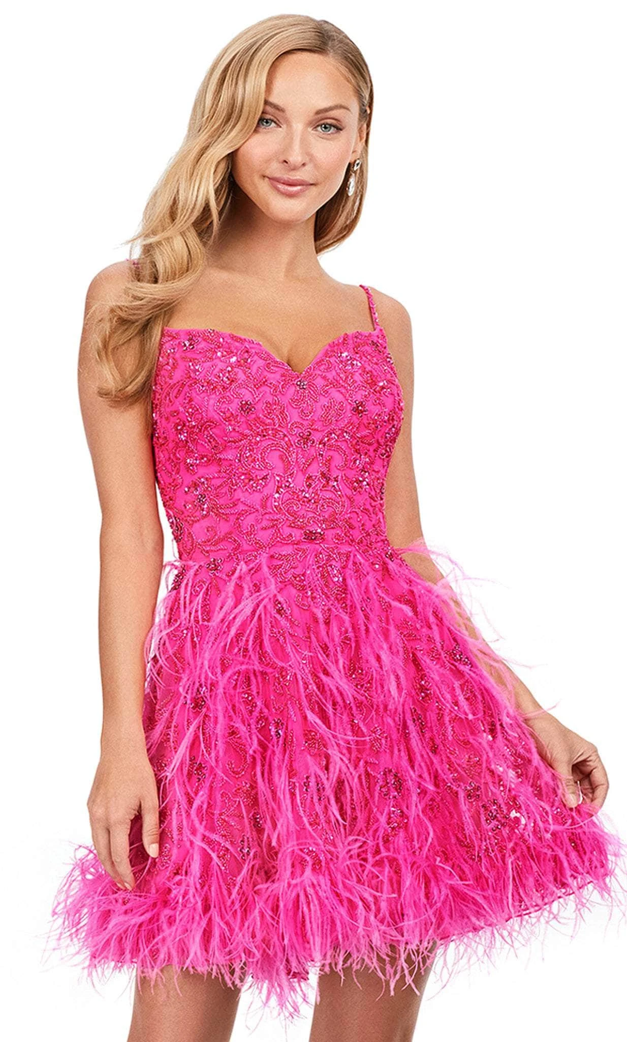 Leave a lasting impression as you appear in this Ashley Lauren 4604 masterpiece. Designed with all-over sparkling beadwork and complemented by feathers on the skirt, this sleeveless dress is a show-stopper. The bodice has a sweetheart neckline held by the adjustable spaghetti straps, while the back is mid-open to show just the right amount of skin. The skirt is styled in an A-line silhouette that cascades to the short hemline. Get the party started in this spectacular dress from Ashley Lauren 4604. Models are wearing the Ivory, Lilac, Neon Pink, and Sky colors.
