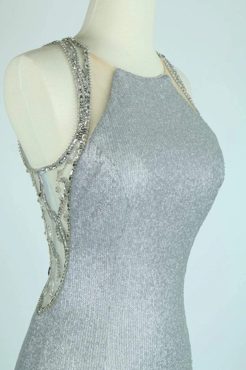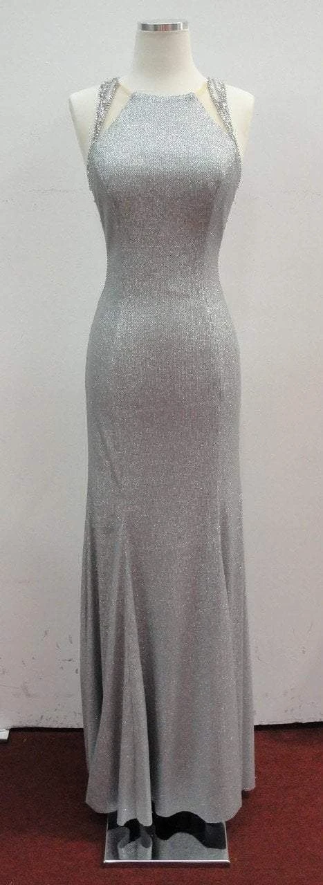 | Details: | Sleeveless, Fitted bodice, Sequins, Jewel accents, Shimmer fabric, Open back, Sheath skirt, Back zipper |