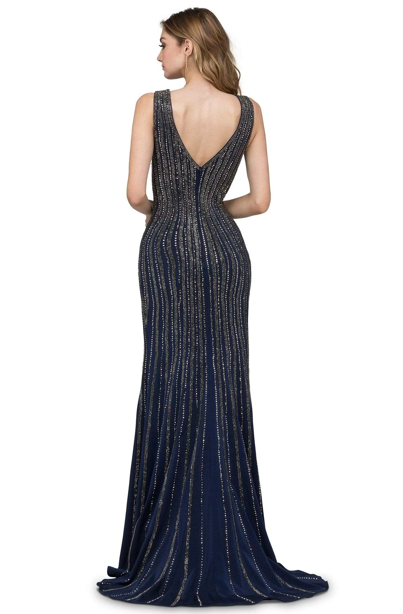 Shine through the night in this mesmerizing look by Cecilia Couture 1410. Brandishes in a sleeveless, deep V-neckline with sheer inset at mid-bust. This beaded dress is styled with a V-back and a full length skirt with a sweep train finish. Wow everyone in this sophisticated design by Cecilia Couture. Model is wearing Navy color.