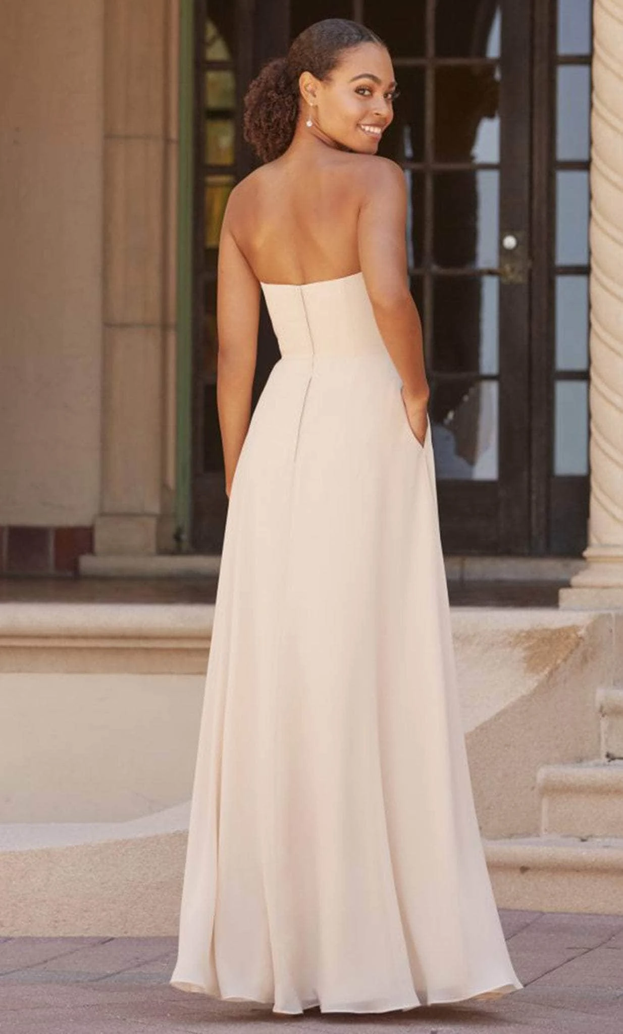 Fall in love with the sheer elegance of this ethereal dress by House of Wu 22156 creation. Prepare to be smitten with this whimsical piece tailored in chiffon fabric which features a strapless straight neckline. The flowing A-line skirt has side pockets and ends in a full-length hemline. Radiate pure elegance as you dance the night away in this fantastically ornate House of Wu 22156 creation. Models are wearing Frost Rose, Rosewater, and Charcoal colors.