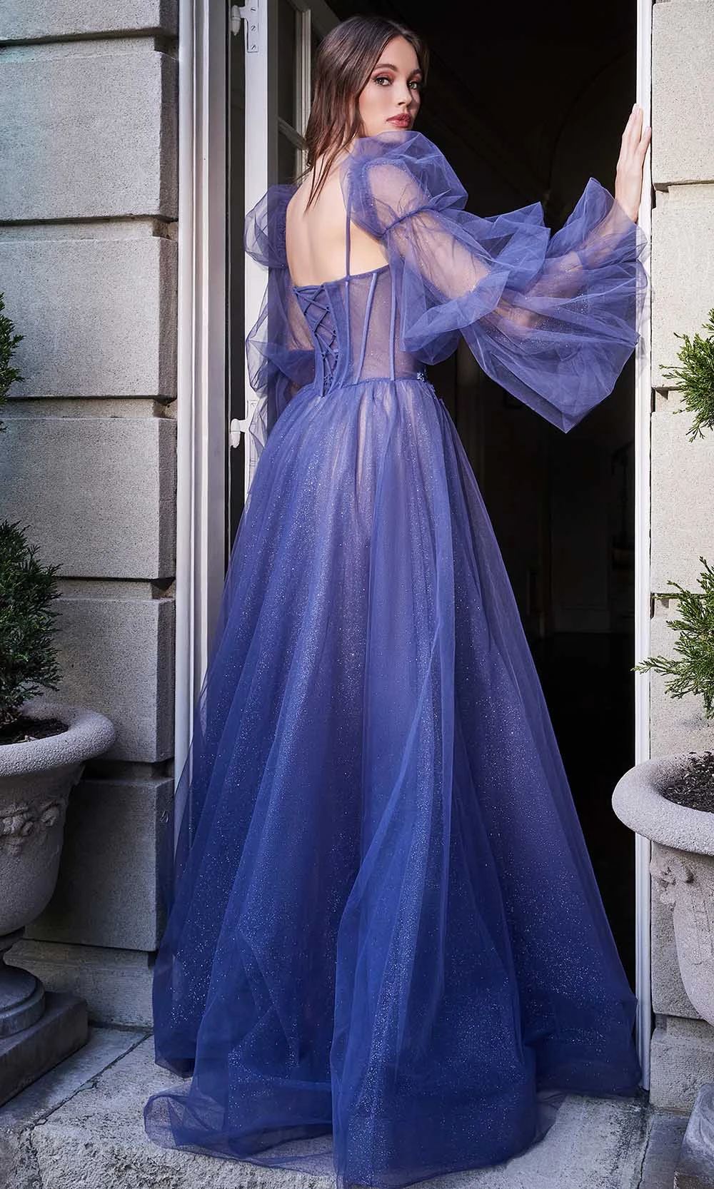 | Details: | Glitter Tulle, Lined, Mesh Inset, Corset, Long Puffed Sleeves, Lace Up Back, Notched, Mid-Open Back, Sweep Train |