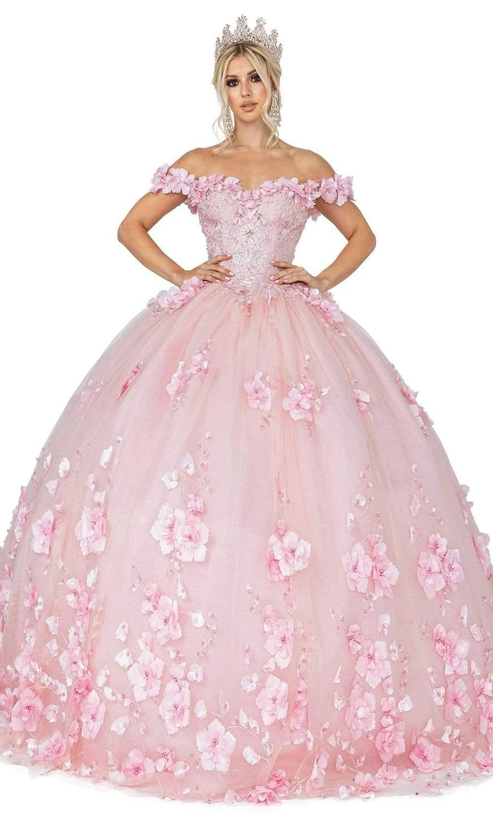 Glide into the room and glow in this exquisite Dancing Queen 1613 creation. Embellished with floral lace bodice and beadwork, the off shoulder gown is accented with floral details. Framed with a corset back, the gossamer skirt cascades into a floral appliqued design and train. Express pure opulence in this Dancing Queen masterpiece. Find more ball gowns.