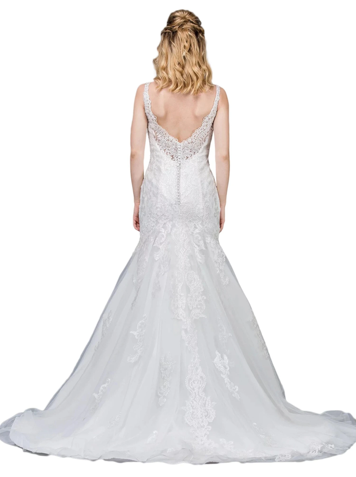 | Details: | Sleeveless, Fitted bodice, Lace appliques, Trumpet skirt, Low V-back, Covered buttons, Sweep train |