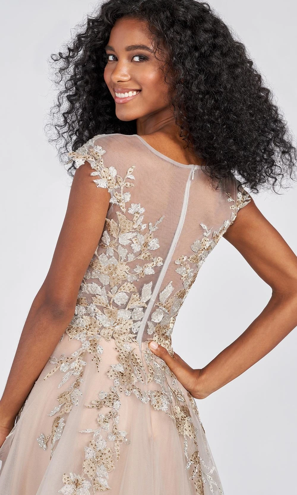 | Details: | Sleeveless, Illusion panel, Tulle, Beads, Sequins, Appliques, Zipper closure, Sweep train |
