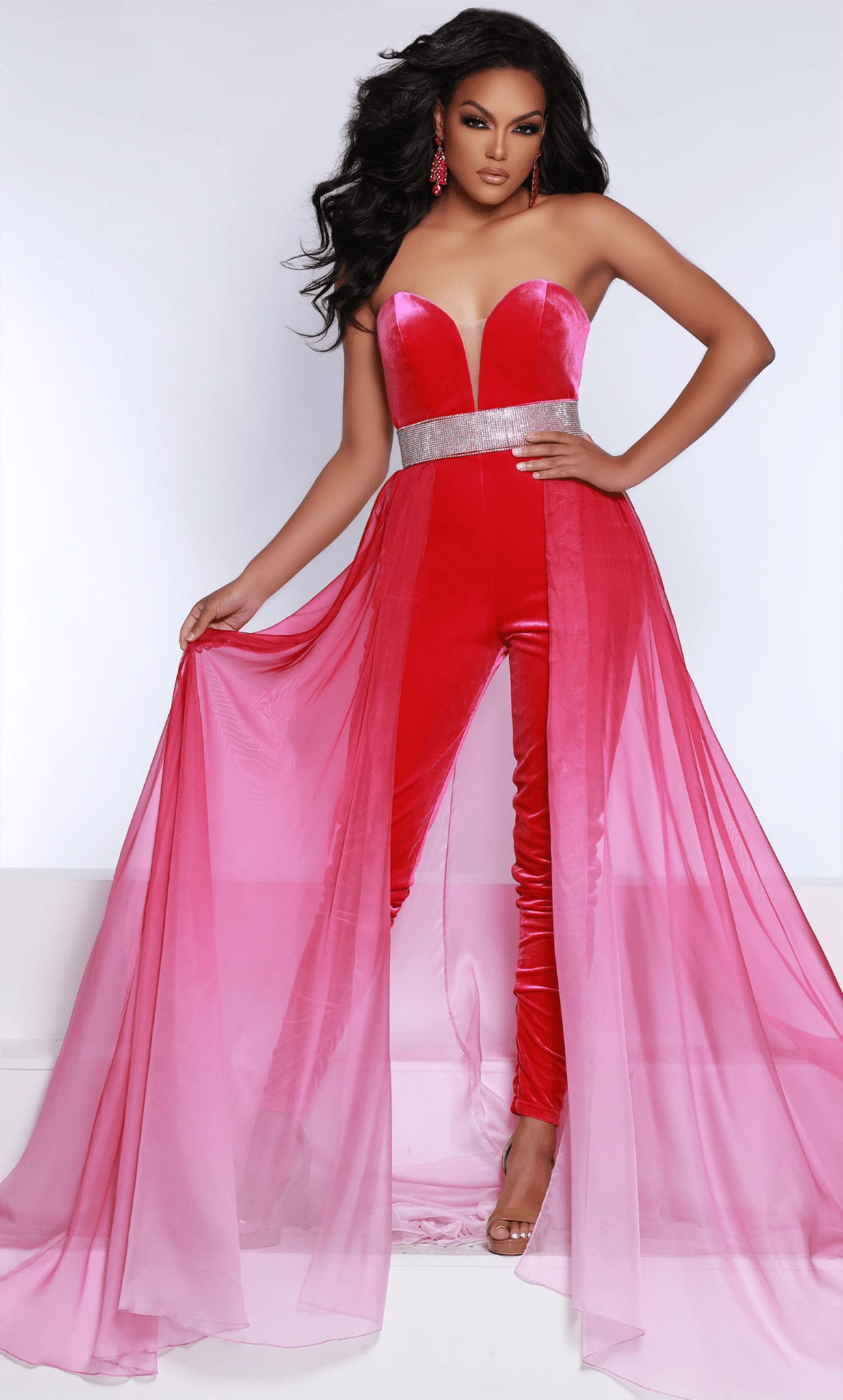 Be a queen of your own right while looking very alluring in this Johnathan Kayne 2609 creation. Designed with tailoring lines on a stretch velvet silhouette, this ensemble features a strapless bodice with a sweetheart neckline and an illusion inset. Wrapped with a crystal embellished waistband, this beauty shows off a pair of fitted pants. Draping with a cascading chiffon overskirt, this ensemble parades an ombre style with a sweeping finish. Flourish a daring style at your event in this Johnathan Kayne masterpiece. Models are wearing the Black, Fuchsia, and Neon Yellow colors.
