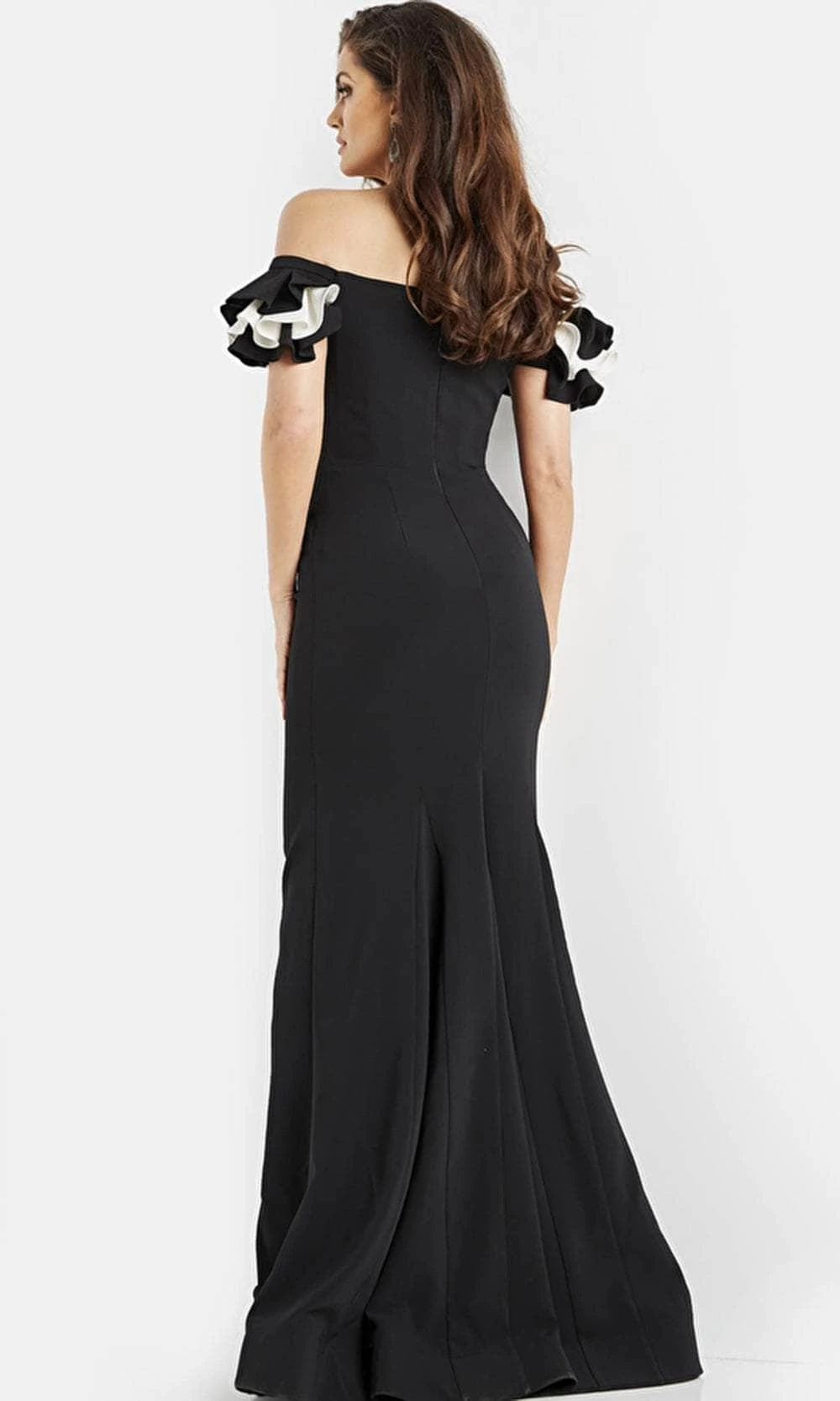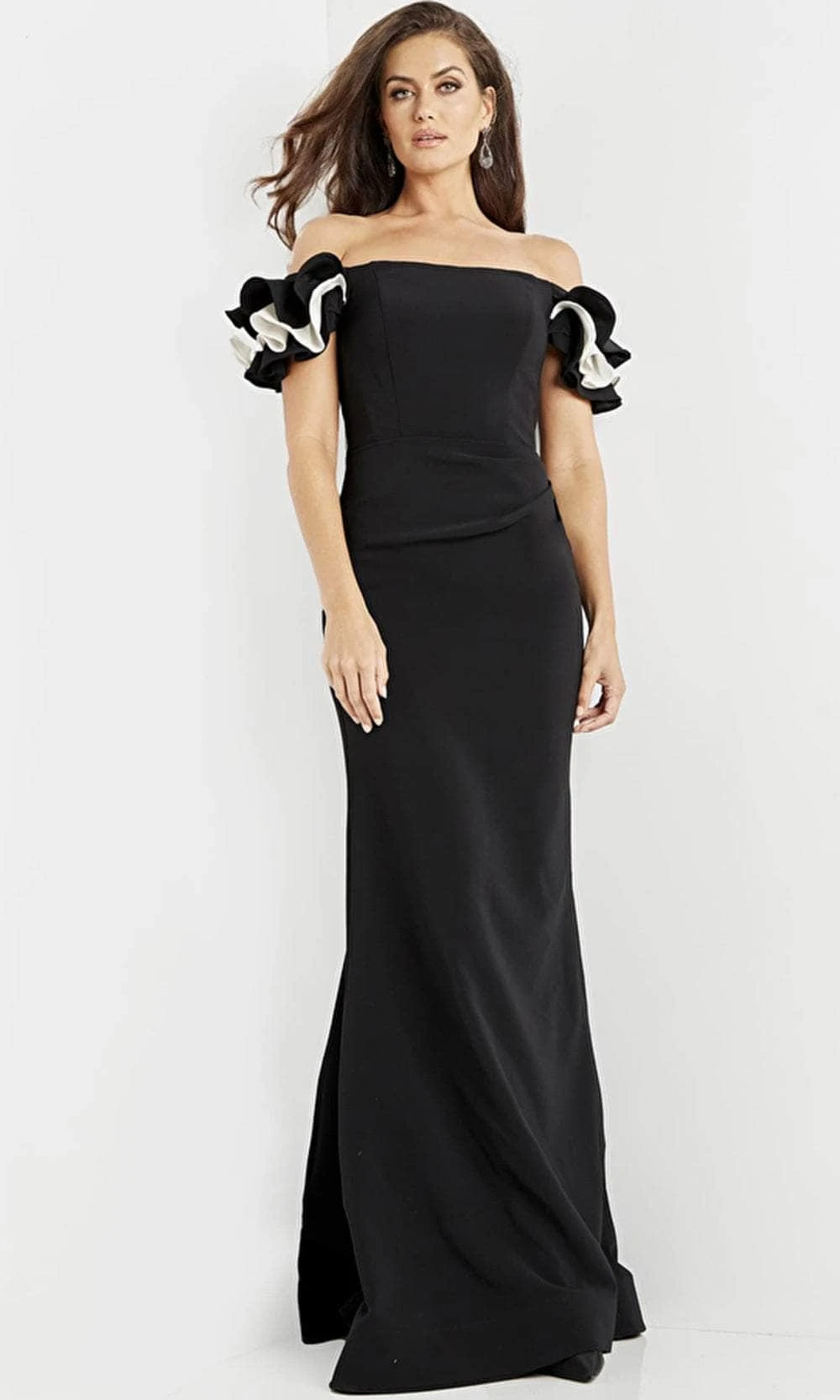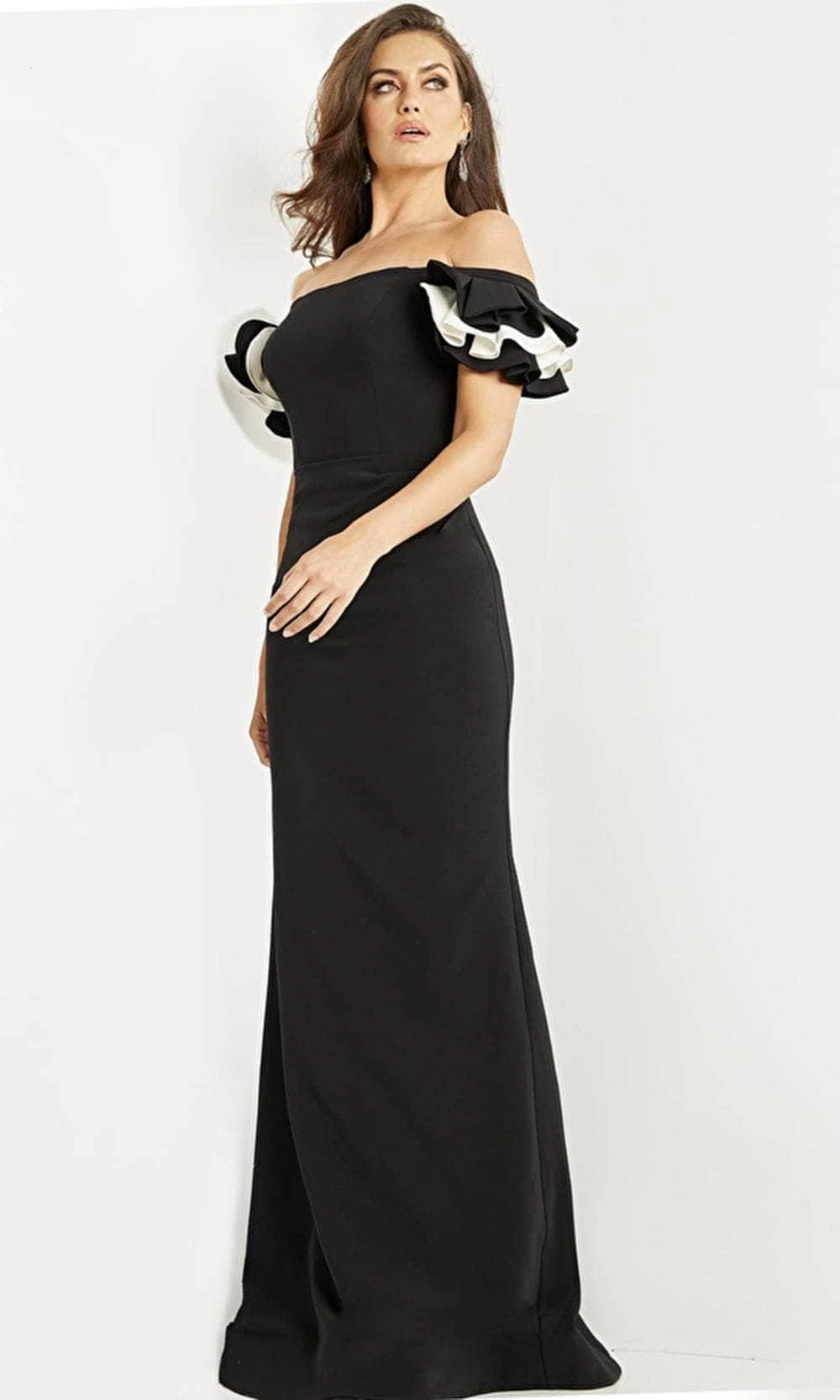 Get glamorous underneath the modern and classic detailing on the sheath silhouette of this simple yet elegant Jovani 07017 dress that features short puff sleeves with an off color middle layer, a figure flattering fitted bodice and a single color body. It also has a high open back and secured with a back zipper, and finishes with a light train and horsehair hem. Simplicity and elegance as defined by Jovani. Model is wearing Black color.