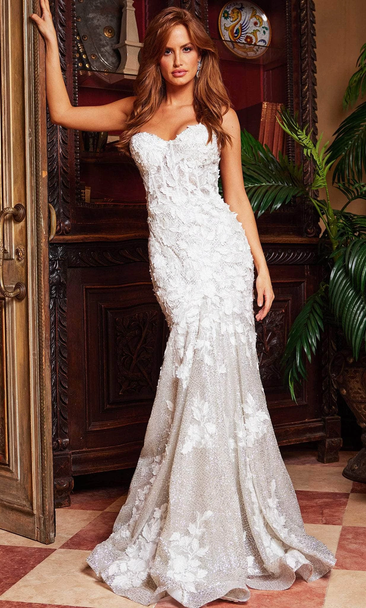 | Details: | Strapless, Sheer Corset Bodice, Floral Lace Applique, Glitter, Mid-Open Back, Back Zipper, Sweep Train |