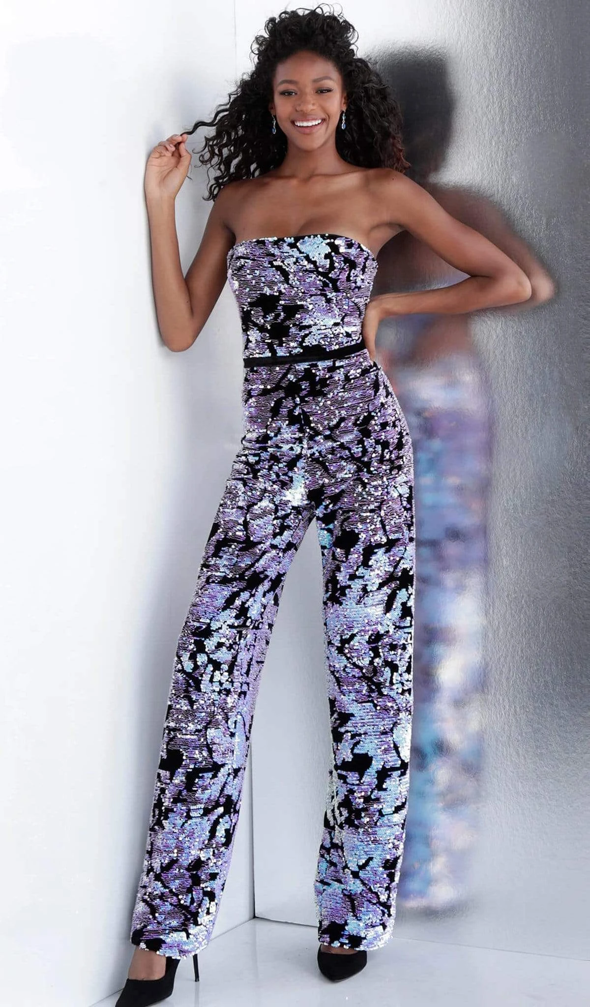 Get the modern look when you appear in this fabulous jumpsuit by Jovani 67849. A straight across neckline frames the strapless bodice complemented with a mid-open back. This piece is crafted in patterned sequins with a thin band that accents the natural waist. The straight leg pants tapers to full length. You are a picture of perfection in this defined Jovani ensemble.