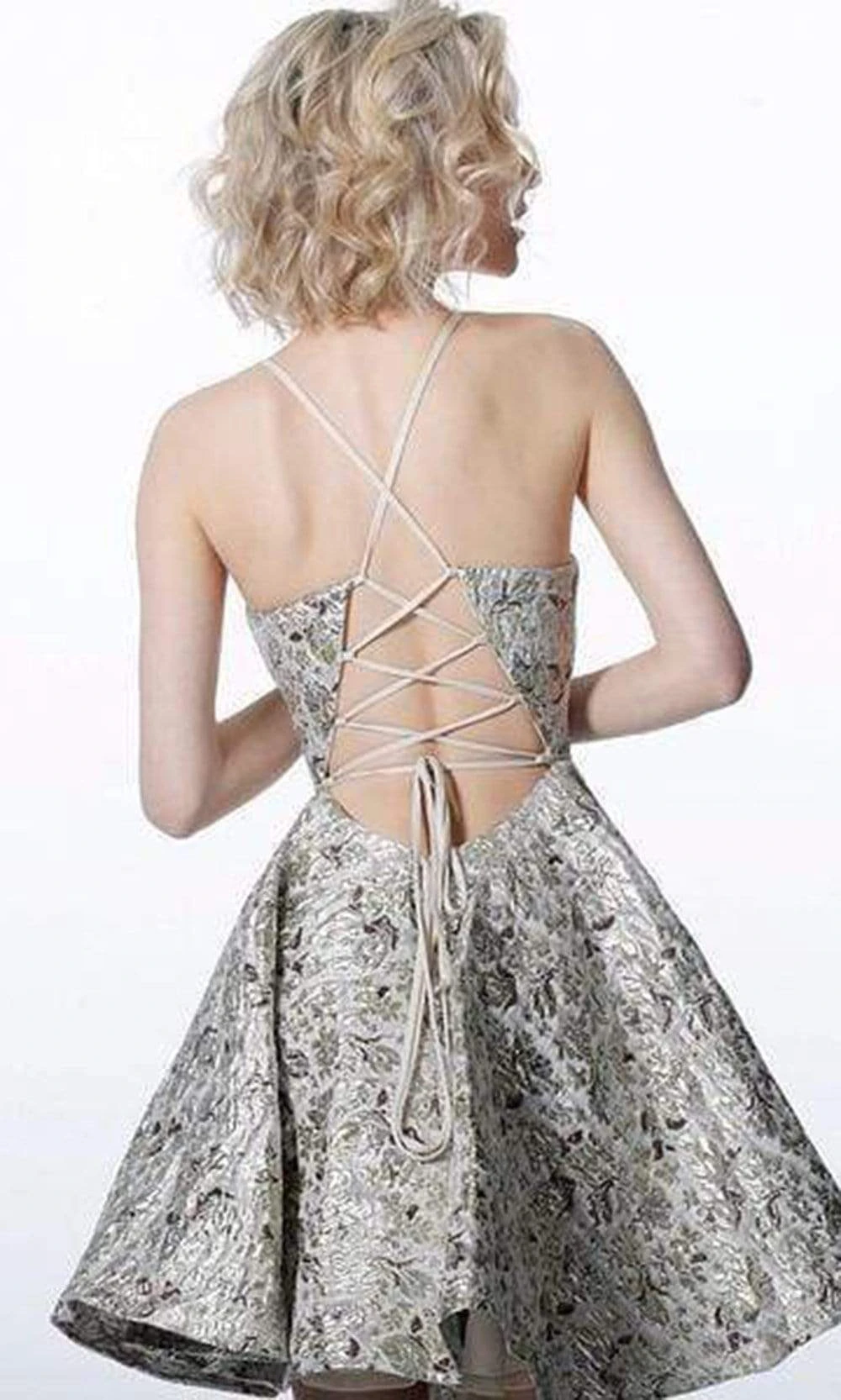 Showcases a sleeveless, deep V-neckline with spaghetti straps. The fitted bodice is detailed with a sheer inset and features a strappy back. The skirt opens in a flirty A-line silhouette and runs at mid-thigh hem.