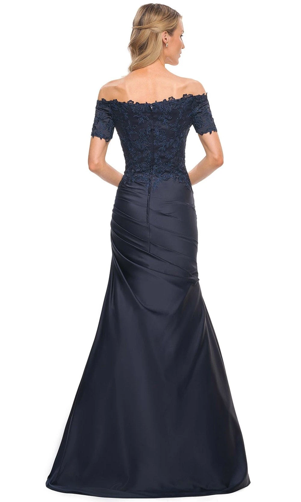Create a lasting impression in this stunning evening gown by La Femme 30199. Short sleeves and a full lace back highlight this gown, which is worn off the shoulder in satin. Pleating along the front and back of the fitted mermaid bodice is simply lovely and will turn heads. The back features exquisite layered lace and a center zipper closure. Be in this elegant La Femme design and fascinate everyone. Model is wearing Navy color. Whether you want an elegant minimalist long gown or an intricately embellished evening dress, La Femme dress collection can give you just the right dress you are searching for.