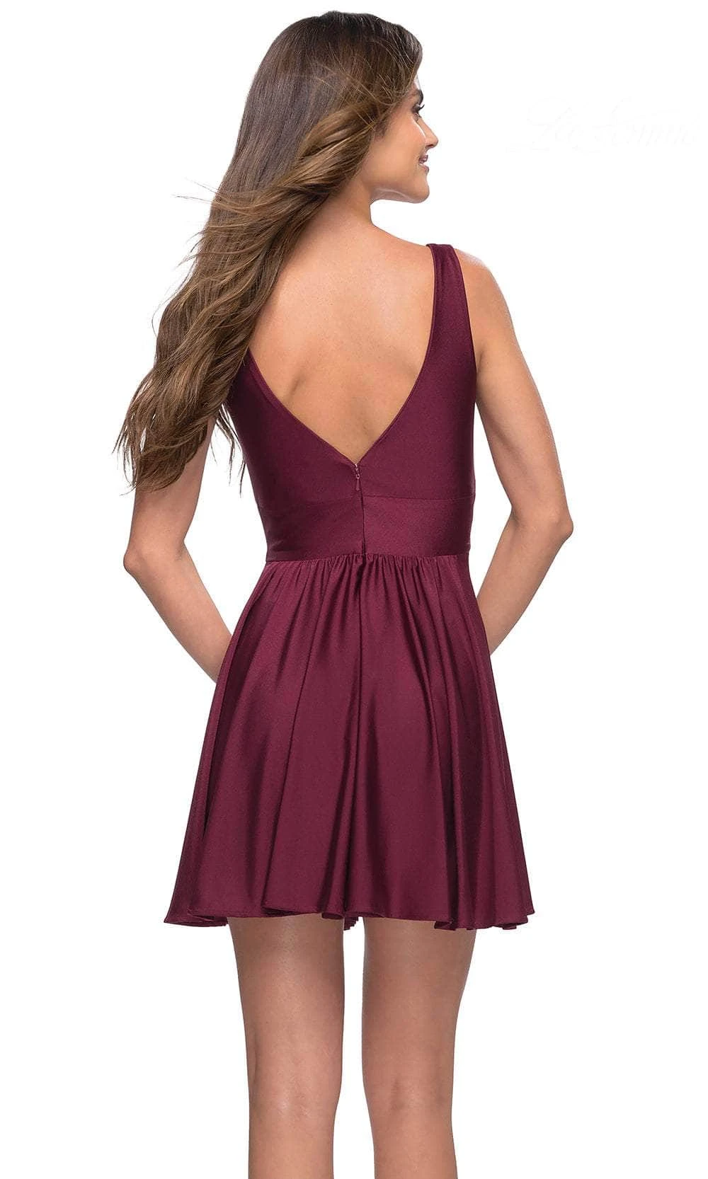 Promote a sterling style as you flaunt a feminine flair in this La Femme 30926 creation. Sleekly tailored with sculpting seams on a satin-like silhouette, this piece flourishes a deep v-neckline on a sleeveless bodice. Accented with fine ruching accenting the bust and cinched with an empire band, this dress crafts a deep v-open back. The A-line skirt softly cascades into a fluttering mini hem. Have the crowd awestruck by this La Femme masterpiece. Models are wearing the Black, Dark Berry, Emerald and Royal Blue colors.