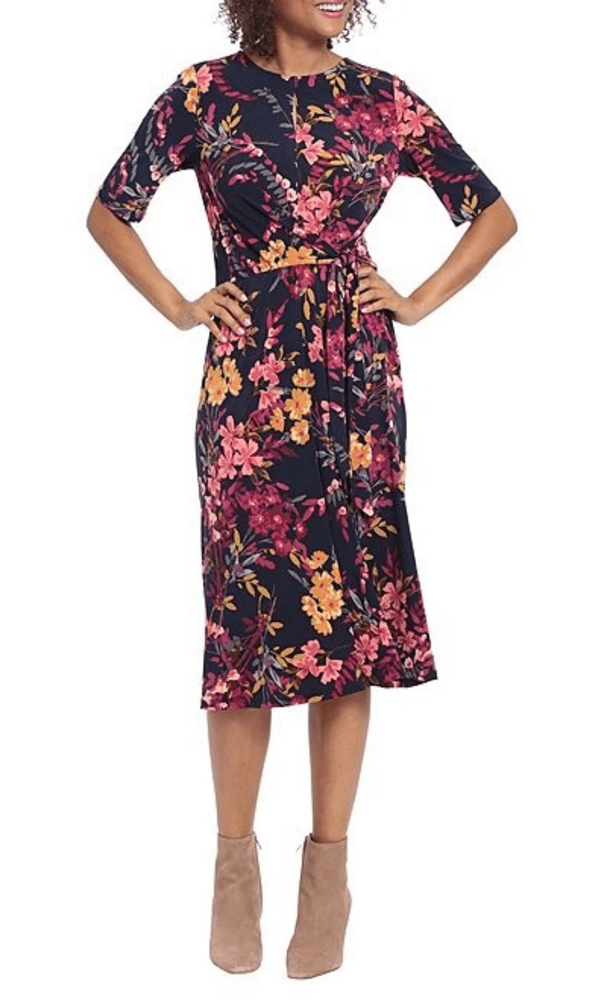 | Details: | Floral, Half Length Sleeves, Keyhole Front, Enclosed Back, Tie Waist |