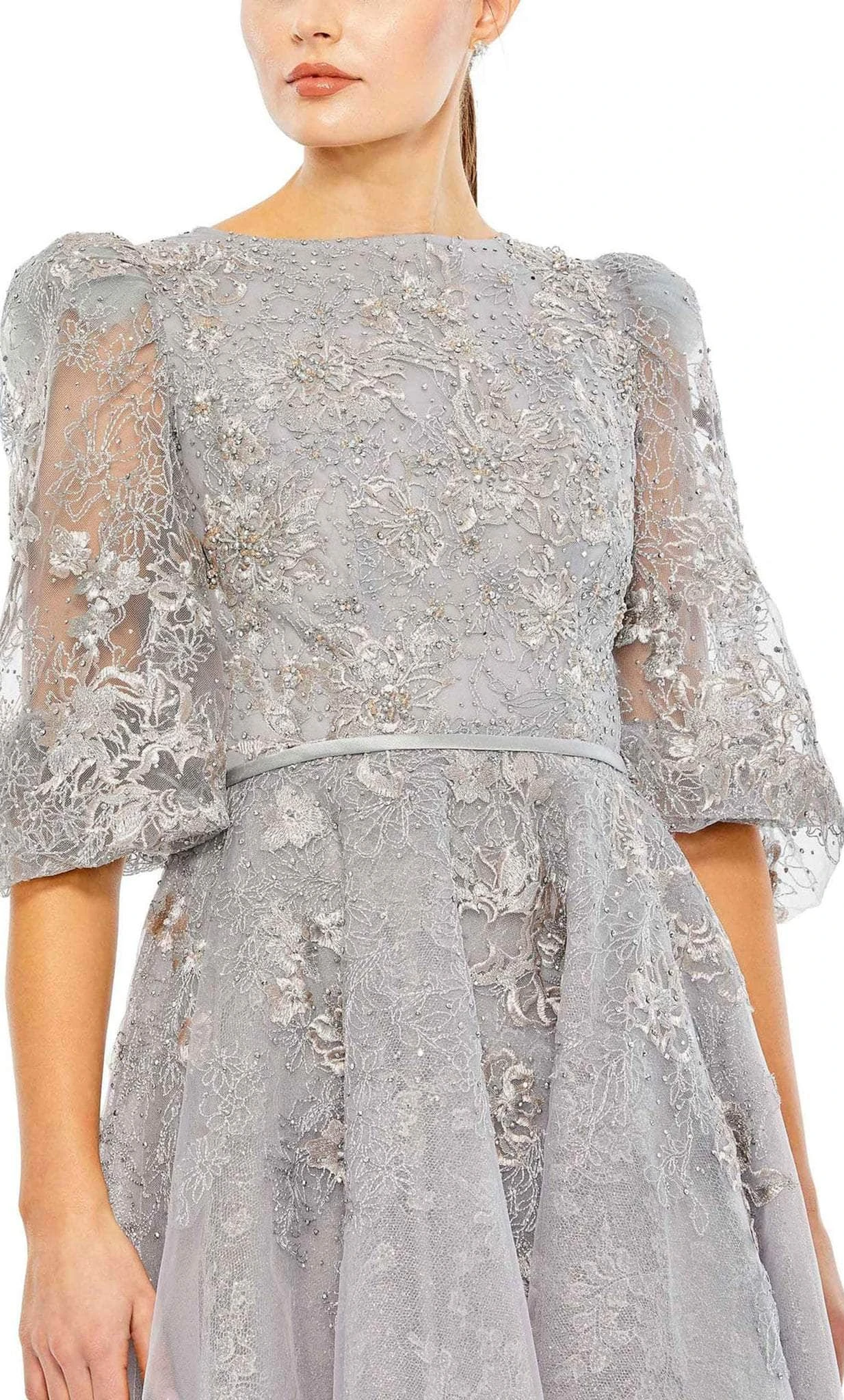 Show up in this Mac Duggal 20418 that has the perfect amount of glitz and glamour. Elegantly framed with unique puff elbow-length sleeves, this embellished lace dress shows a bateau neckline with a full back secured with a center zipper closure. A thin waistband hugged the natural waistline and the A-line skirt cascades into a beautiful tea-length silhouette. Show off your softer side in this lovely prom dress by Mac Duggal 20418. Model is wearing Platinum color.