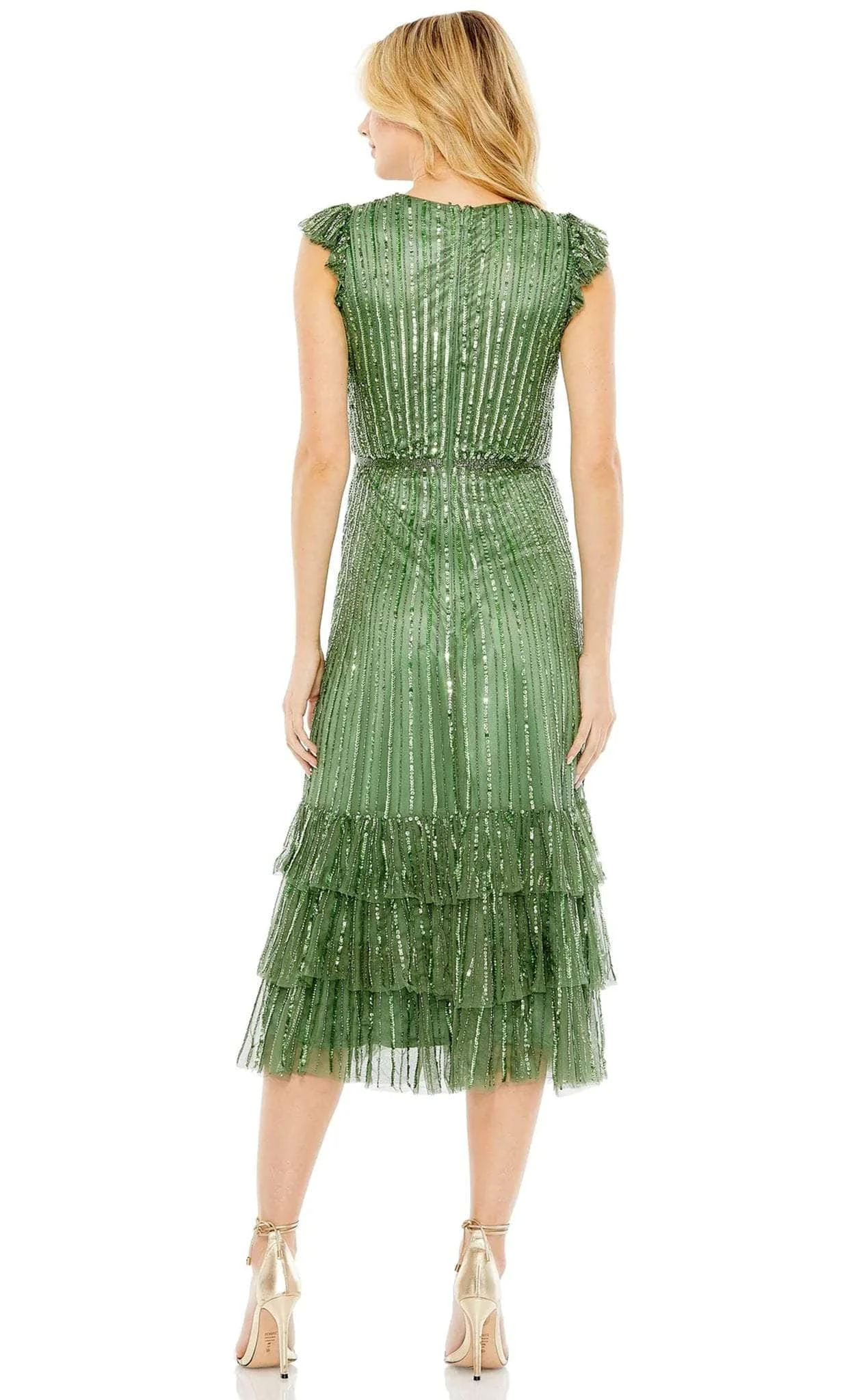 Everyone will be captivated by this charming Mac Duggal 55847 creation. The feminine elegance of this gorgeous piece is highlighted by a V-neckline that is crowned on a wrapped-style bodice lavishly adorned with dazzling sequins all over. This ensemble has a full-back that is secured with a center zipper closure and the tiered skirt displays an A-line silhouette that cascades to the knee-length hemline. Every woman dreams of this beautiful formal dress from Mac Duggal 55847 masterpiece. Models are wearing Burt Orange and Sage colors.