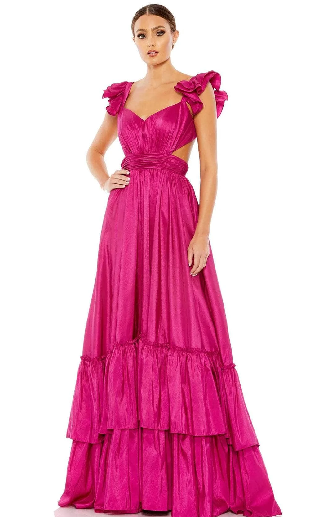 Look fabulous for your event wearing Mac Duggal 68062 creation. Alluringly fashioned in taffeta fabric with ruching detail throughout, this piece displays a sweetheart neckline, flutter sleeves and an open tie back. The natural waist highlights a ruched band and side cutout for a more stylish looking. With a ruffled two-tiered hem, the A-line skirt gracefully streams down to a full length and sweep train. This Mac Duggal 68062 prom gown is sure to be both comfy and fashionable. Models are wearing the Cobalt, Lime and Magenta colors.