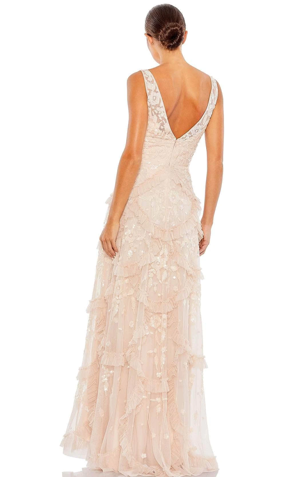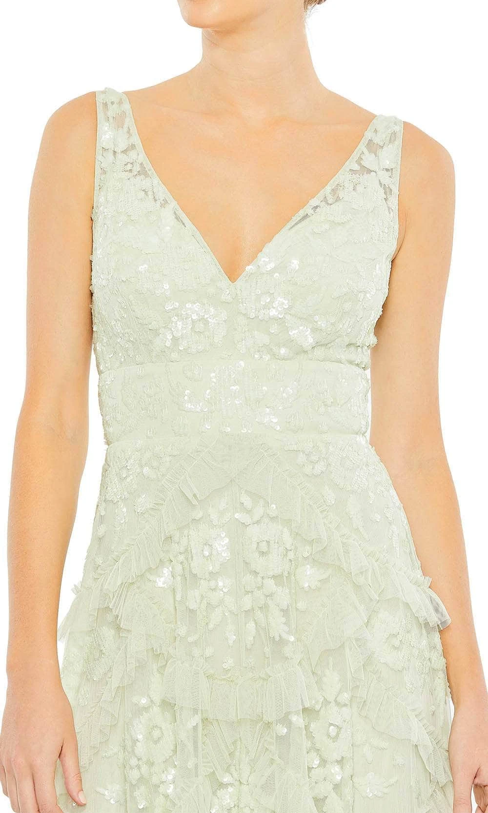 Fall in love with the sheer elegance of this ethereal beauty from Mac Duggal 9162. Exquisite embroideries enclave throughout the dress. Hemmed in a sleeveless frame, this gorgeous piece displays a deep V-neckline with a defined wide waistband. A mid-open back shows off some skin with a zipper closure. Sheer layered skirt with ruffle details cascades asymmetrically down to a floor-length hem. This one-of-a-kind dress is surely to standout in every occasion. Models are wearing Sage and Blush colors.