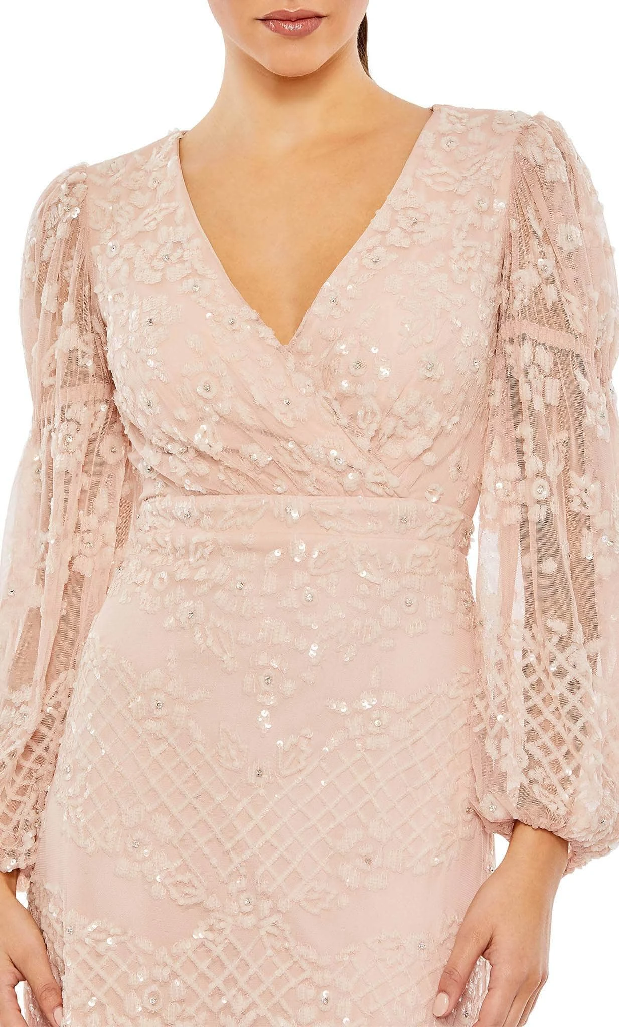 Turn yourself into a head-turning beauty by slipping into this absolutely eye-catching Mac Duggal 9197. A perfect dress for ladies who prefer wearing gown that shows less skin. This dress features a long, sheer bishop sleeves matching the V neckline. The whole piece is embellished with clear sequins and has a subtle amount of shine. Back is enclosed using a zipper closure. Commence a new chapter of your journey to forever in this fascinating Mac Duggal 9197 creation. Model is wearing Blush color.