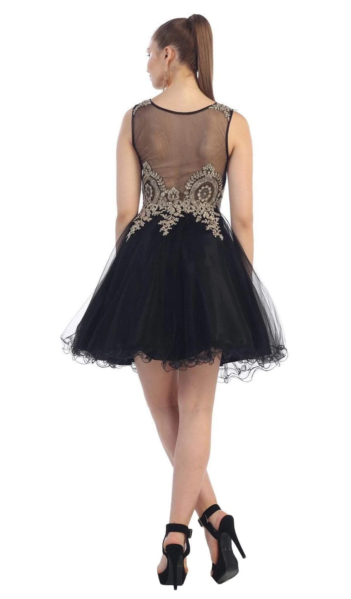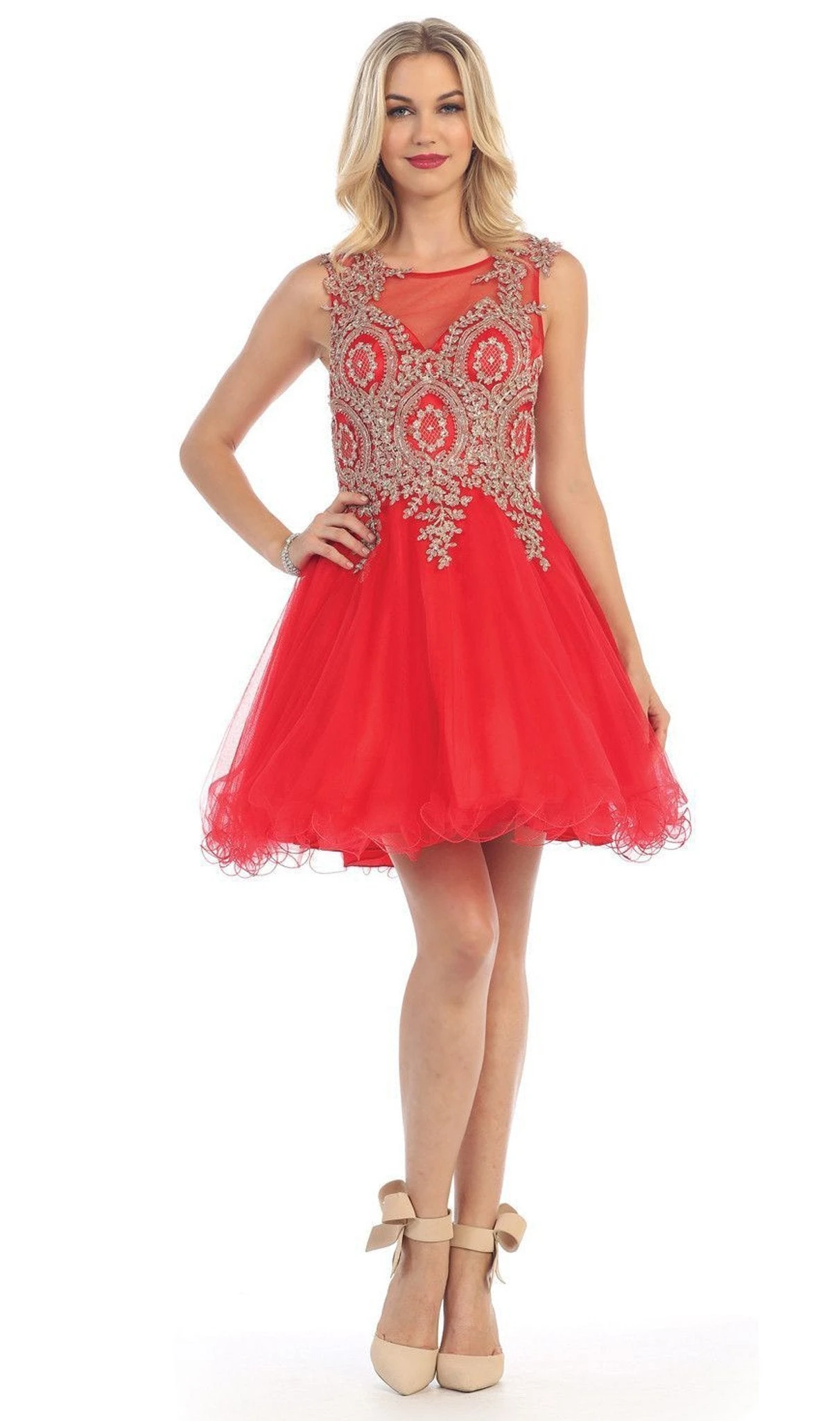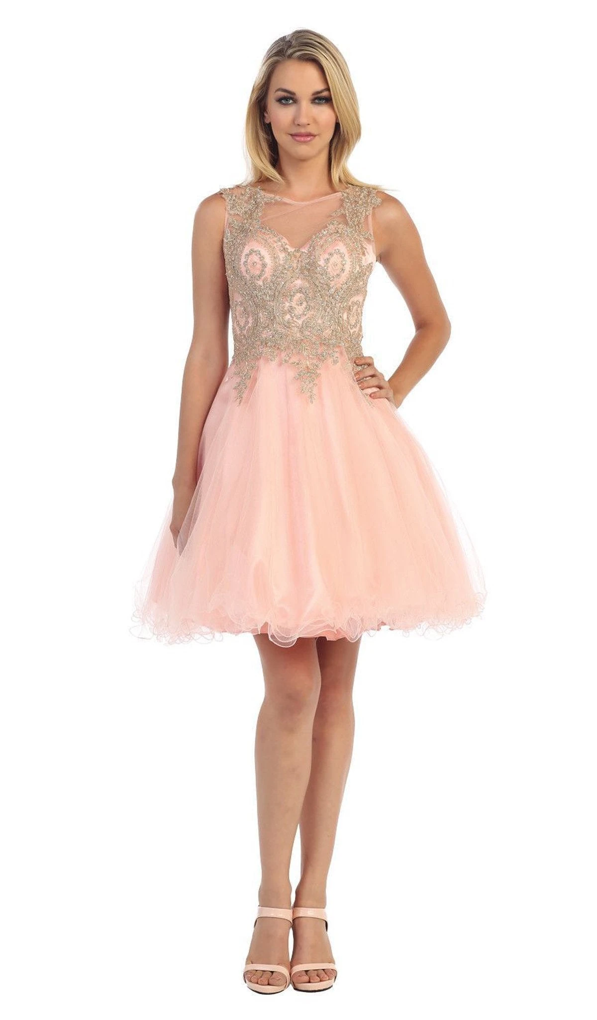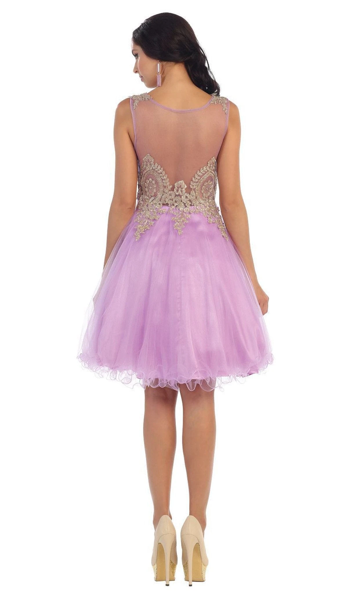 Grace every party in fascinating style as you aspire to be the darling of the ball in this exquisite May Queen MQ1261 creation. Festooned with delicate ornamented lace speckled with jewels, this stunning piece shows off a sleeveless bodice topped with an illusion bateau over a sweetheart neckline. This ensemble also boasts of a sheer full back flourishing intricate adornments. Gossamer layers cascade the A-line skirt as it rushes voluminously down to a rolled short hem. Leave a trail of besotted admirers as you radiate beauty and style in this opulent May Queen masterpiece.