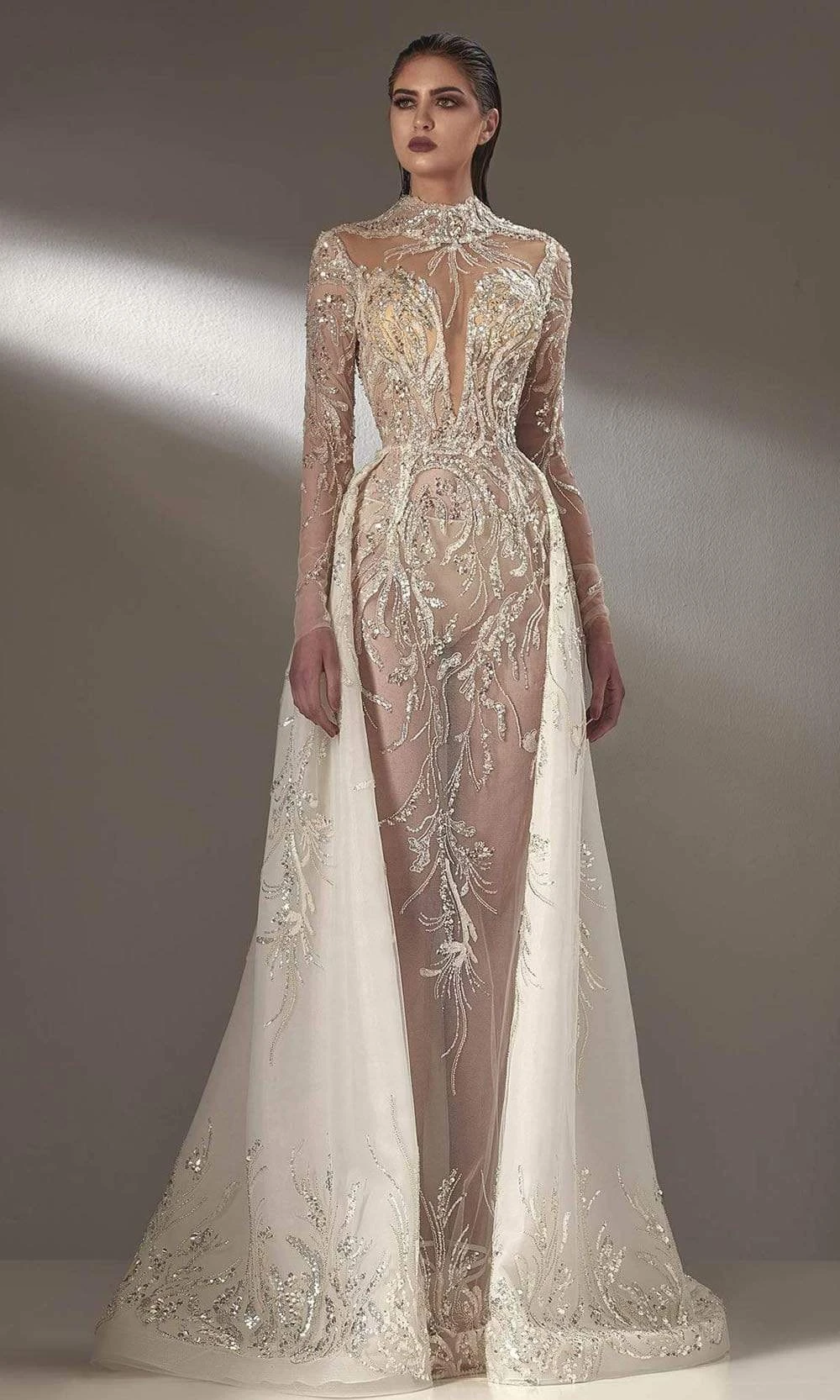 Dress to impress on your next formal event in this alluring MNM Couture K3895 evening dress. This dress fashions a high neckline supported by long sleeves in a beaded bodice. Having a sheath/A-line silhouette with A-line overskirt, this also shows a full back with back zipper closure. Be ready to catch everyones eyes in this MNM Couture creation. Model is wearing Off White color.