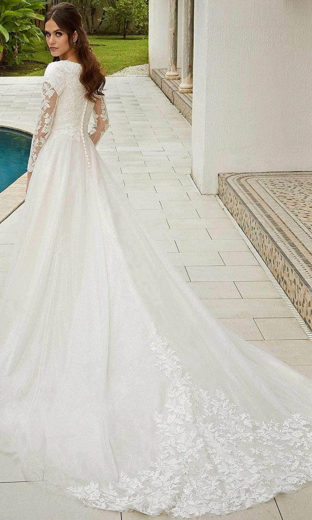 Take their breath away with this stunning Mori Lee Bridal 30122. With its long sleeves, which highlight a V-neck neckline, and a full-back with button closure that is adorned with floral applique, you will look elegant and smart. This wedding dress will give you self-assurance because of its A-line silhouette, which sparkles like a diamond thanks to the sparkling tulle and lovely lace, and its floor-length sweep train. This Mori Lee Bridal will enhance your appearance. Model is wearing Ivory/champagne color.