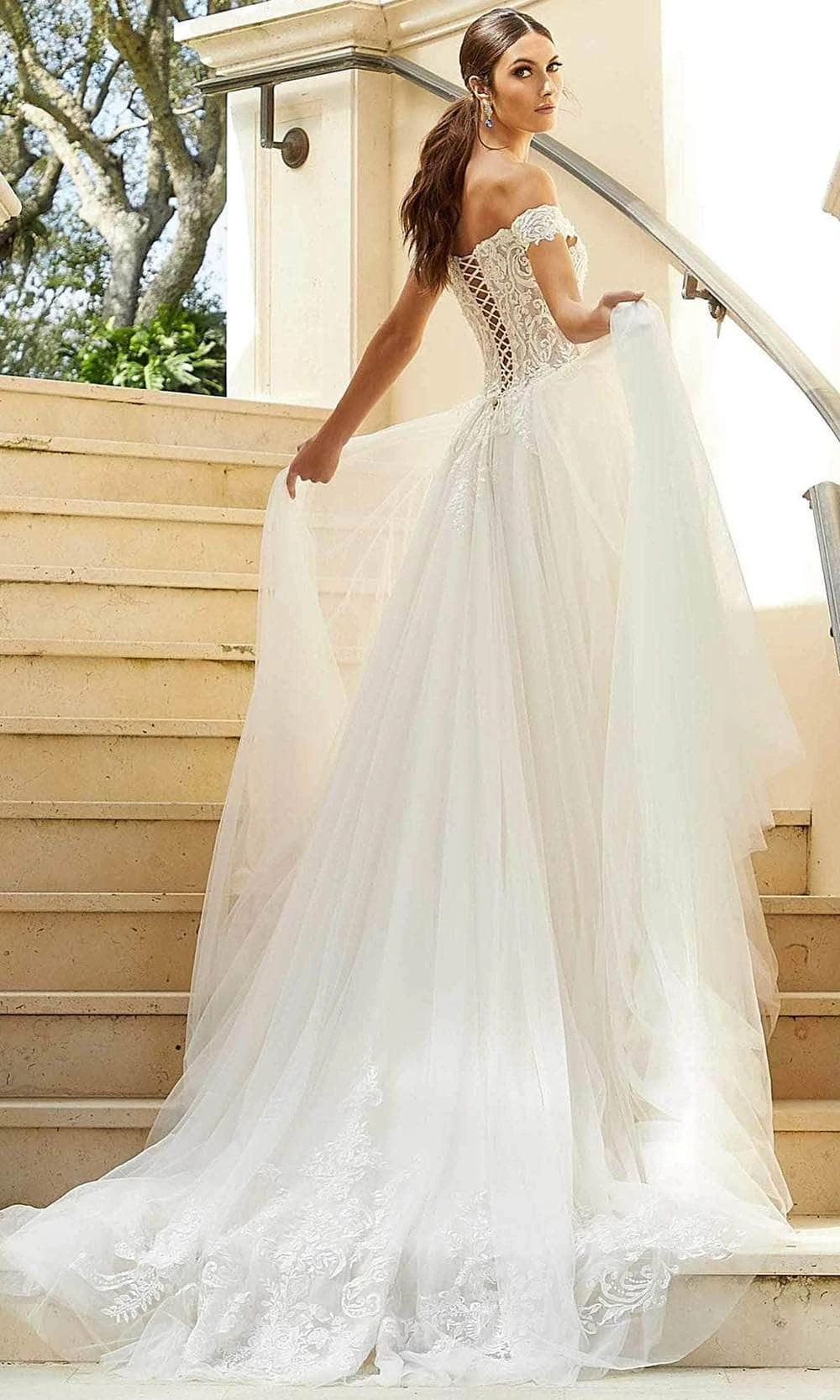 Look classy in a traditional wedding gown from Mori Lee Bridal 5987. Intricate floral lace embroideries festooned this off-shoulder ensemble. Sculpted with sheer corset boned bodice, it features a sweetheart neckline and a lace up tie highlighting the mid-open back. A cinched on the natural waist crowns the mellifluous A-line skirt and effortlessly streams down with a chapel finish. Beam with pride as you walk down the aisle in this creation by Mori Lee Bridal. Model is wearing the Ivory/Almond/Honey color.