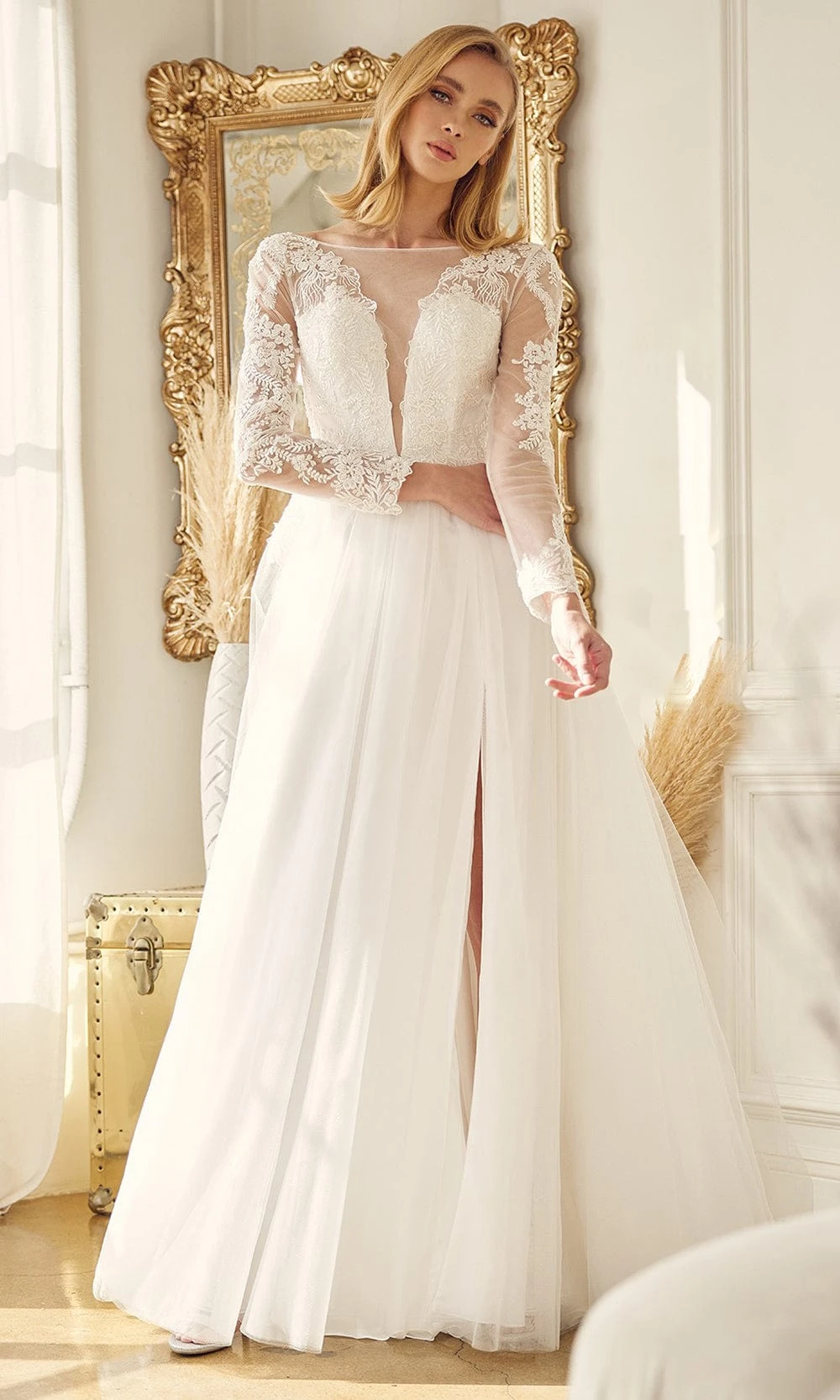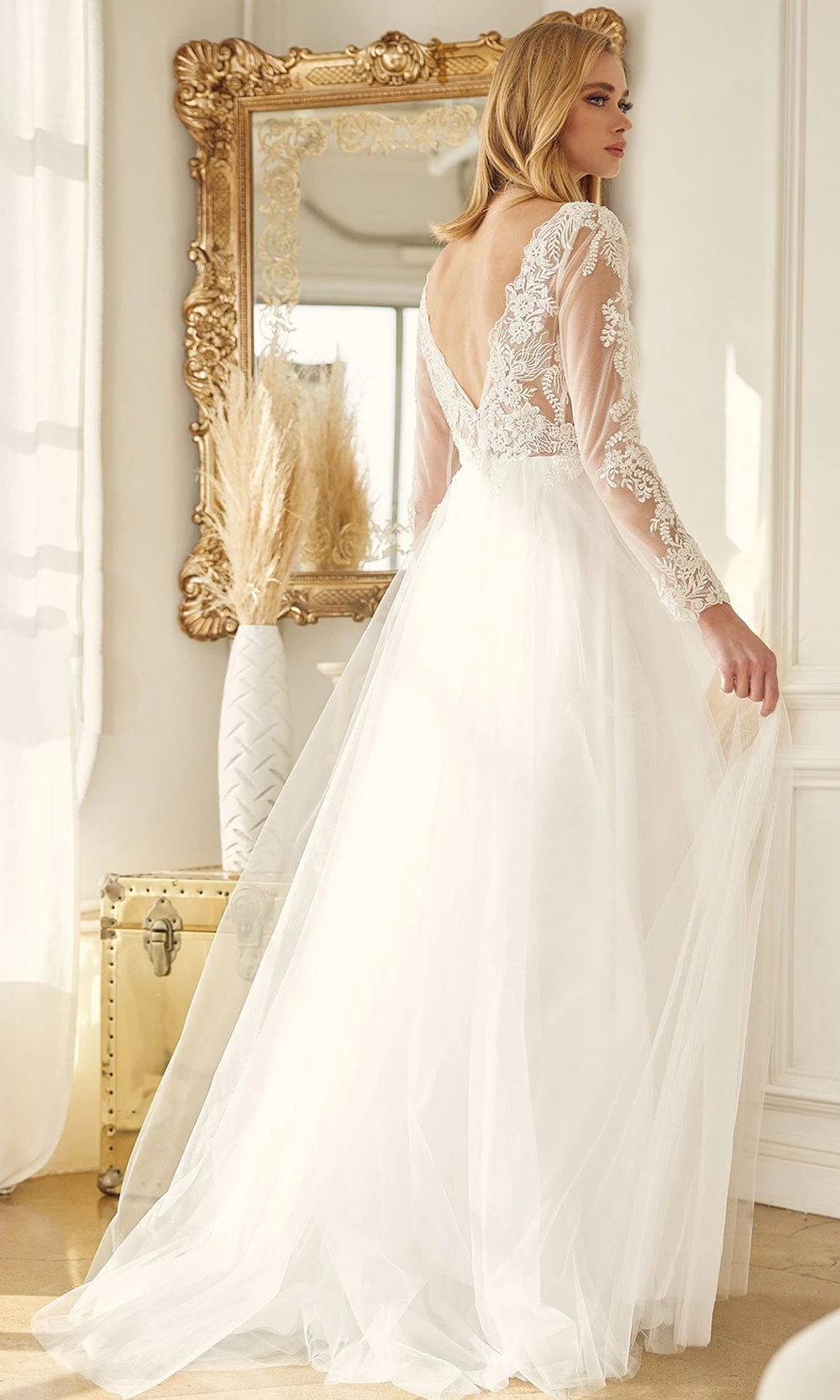 Step out in a gorgeous creation from Nox Anabel Bridal JE911. Intricately detailed with floral embroidery and beaded-ornate, this gown showcases an illusion bateau neckline, long sleeves and V-back. It has a back zipper closure while the A-line skirt cascades down to full length hemline and ends with a sweep train. A front side thigh-high slit completes this look. This Nox Anabel Bridal wedding gown boasts undeniable glamour in a chic silhouette. This stunning collection of Nox Anabel dresses will reflect your personality and give you an elegant red-carpet look. Model is wearing White color.