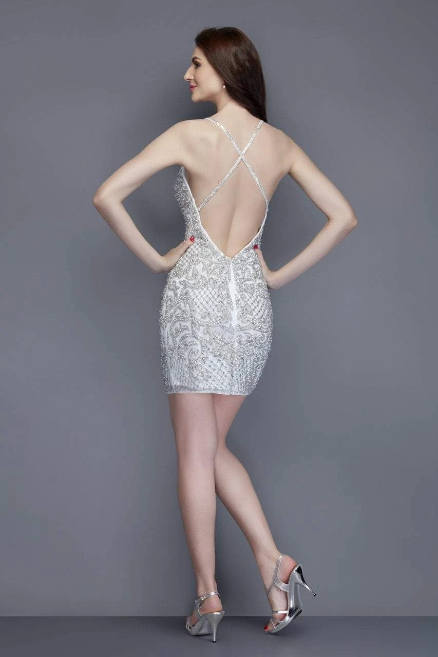 This cocktail dress charms in a sleeveless, plunging V-neckline with a crisscross back. The fitted bodice has a back zipper closure and fully adorned with sparkling jewel accents. The skirt tapers at the thighs and runs at mid-thigh hem.