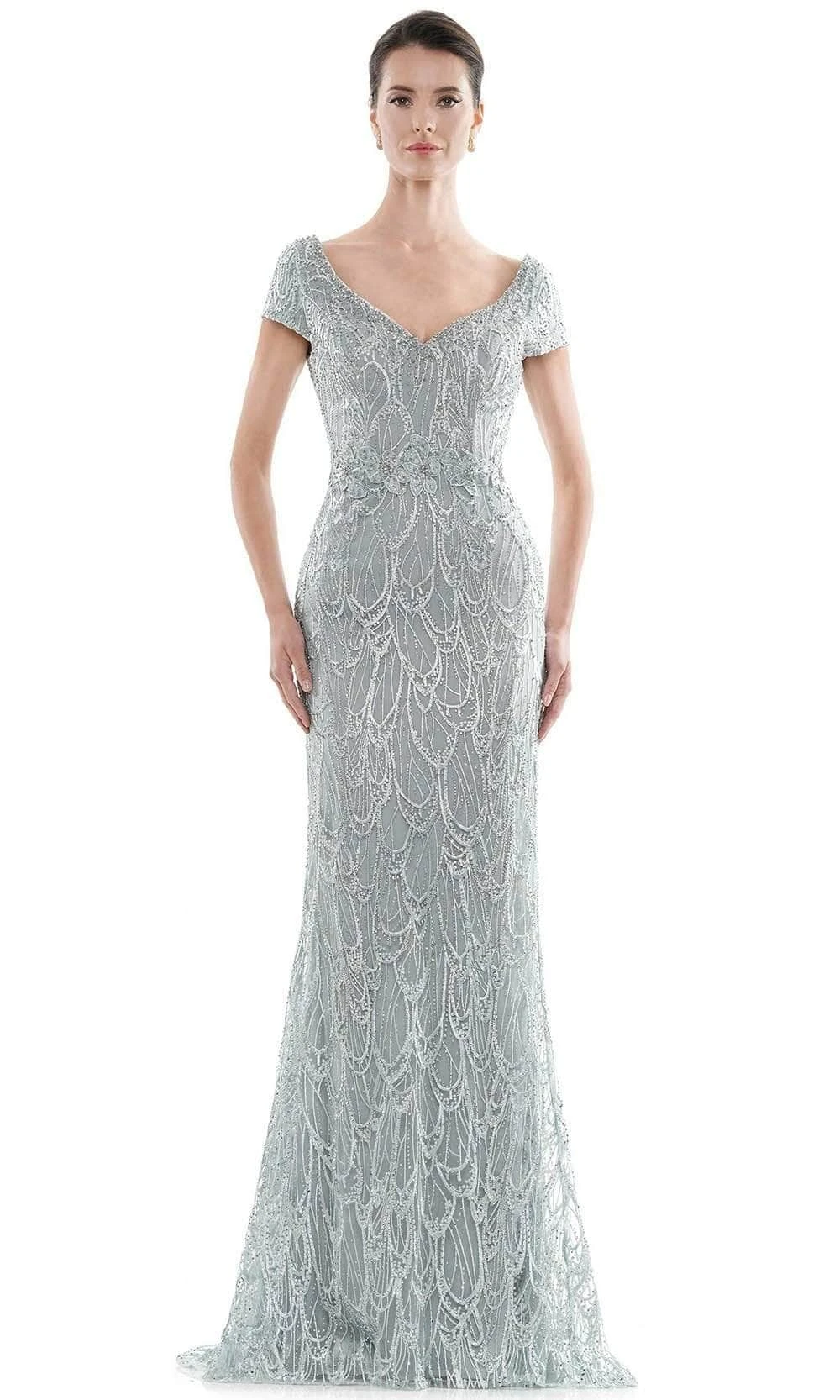 This elegant piece stands out with lavish embroidery and beading on mesh while showing off a captivating portrait style V-neckline with short sleeves. The back opens with wide V shaped with center zip up closure ensuring a relaxed fitted bodice. The natural waistline gives way to a full-length column skirt that finishes with a subtle train for added flair. Model is wearing the Seaglass color.