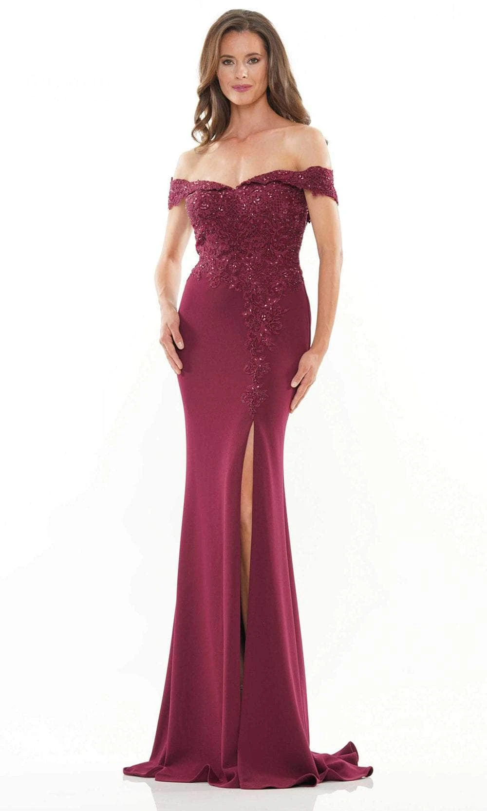 Shine with the glow of ever after in this mesmerizingly mother-of-the-bride gown from Rina Di Montella RD2728 creation. This stunning gown features an embroidered bodice and an off-shoulder neckline with a sweetheart lining, while the gorgeous sheath skirt ends in a floor-length hem and has a thigh-high slit, enough to show off your legs. Mesmerize the crowd with your sophisticated flair in Rina Di Montella RD2728 masterpiece. Models are wearing Navy, Taupe, Wine, and Blue Iris colors.