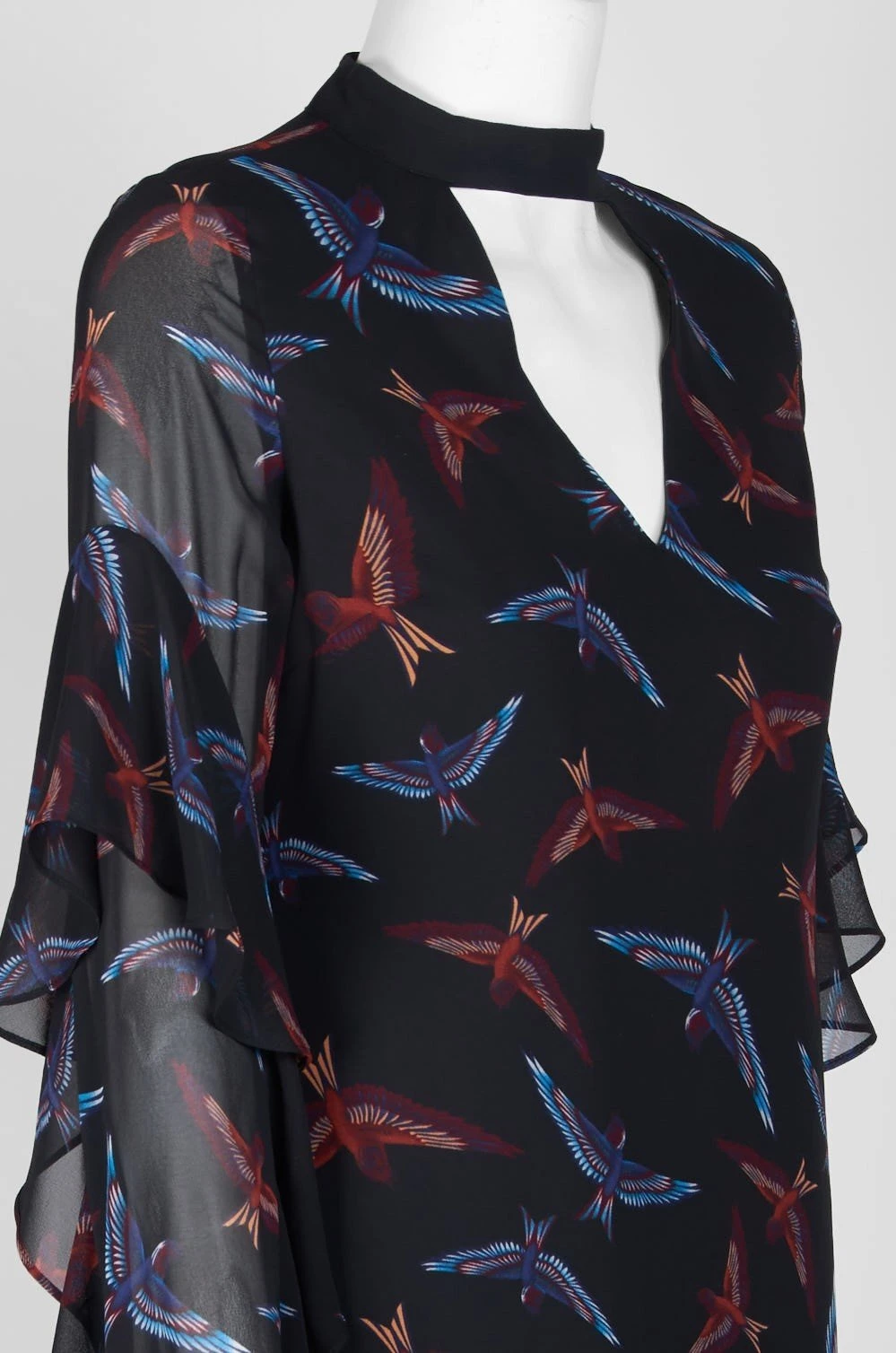 Inspire the crowd to follow your stunning grace while looking so chic in this Sam Edelman 64H091 creation. Perfectly crafted on a bird print sheer chiffon fabric, this alluring piece reveals a high neckline with a choker accent and a deep inverted triangle cutout. Framed with slender long sleeves detailed with sheer ruffled accents, this ensemble unveils a full back as it columns softly to a short hemline. Go for a romantic look as you float throughout the day in this Sam Edelman masterpiece.