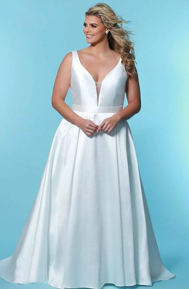 Walk down the aisle like a striking vision in this romantic Sydney’s Closet SC5229 creation. Exquisitely designed with tracing lines on a rich Mikado fabric, this timeless piece flourishes a plunging v-neckline with an illusion modesty inset. Complemented with a deep v-open back, this ensemble is embraced with a simple band. The cascading A-line skirt flares into a full-length hemline and a sweeping train. Have all eyes on you as you say your “I Do’s” in this Sydney’s Closet masterpiece.