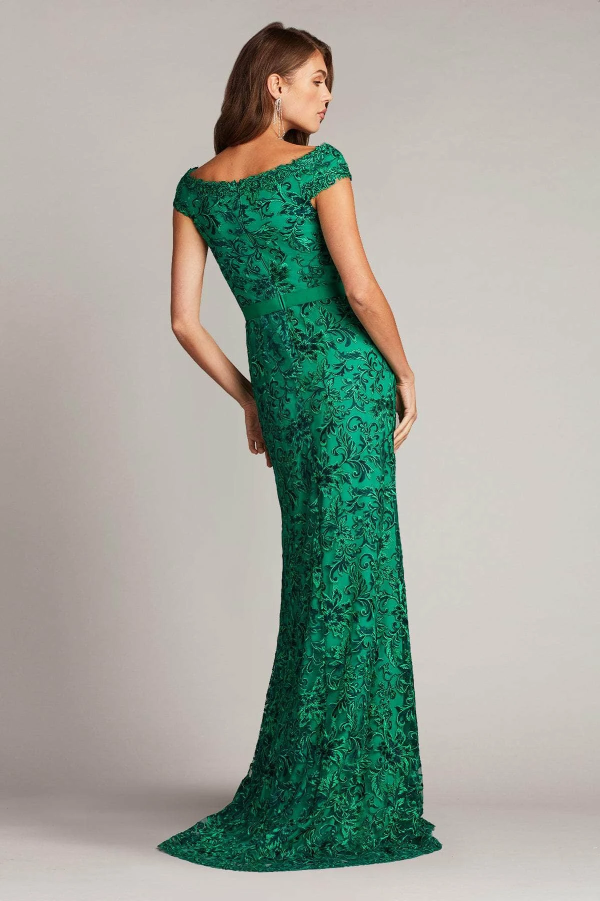 Be the epitome of simple elegance in this Tadashi Shoji BVZ19827L formal dress. The fluid-lined lace motif creates a luxurious texture, while the v-neckline kisses the collarbones’ outer edges, exuding sophistication. The attached grosgrain elastic belt cinches your waist, creating a flattering silhouette. Lined in soft, stretch jersey, this dress will keep you comfortable all night long. The center back invisible zipper ensures a seamless finish, while the sheath silhouette and short sleeves exude effortless style. Perfect for any formal occasion, this dress is sure to turn heads. Make a statement in the Tadashi Shoji BVZ19827L formal dress. Model is wearing the Pine color.