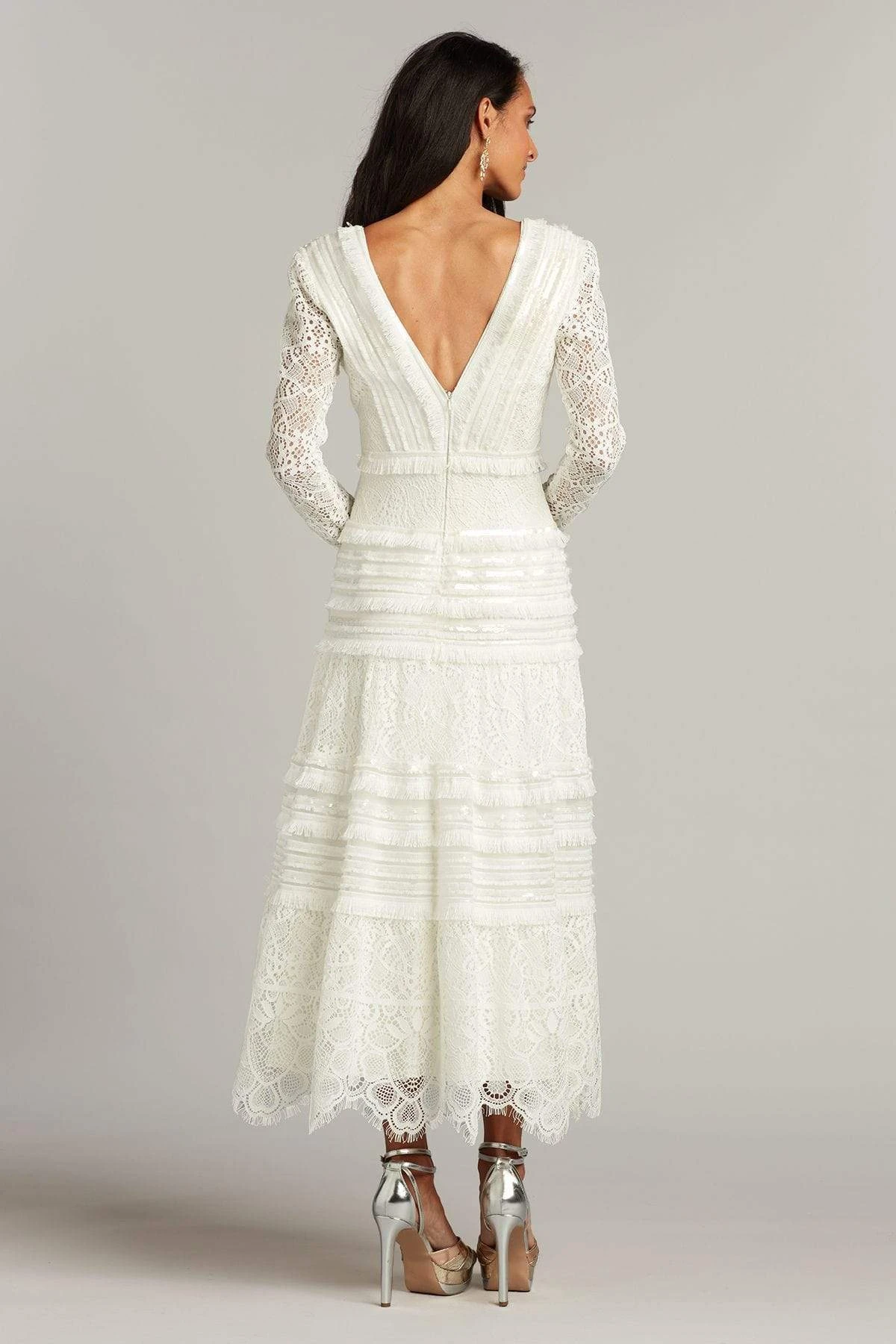 Tadashi Shoji BQU21062MD is a sensual masterpiece that will make you fall in love. The bodice of this lovely ivory embroidered tea length dress has long lace sleeves and a V-plunging neckline. The back features a low V-cut that is secured with a concealed back zip closure. The tea-length skirt cascades into a lovely A-line shape at the bottom. You will be the most fabulous girl at your big occasion if you wear a Tadashi Shoji design.