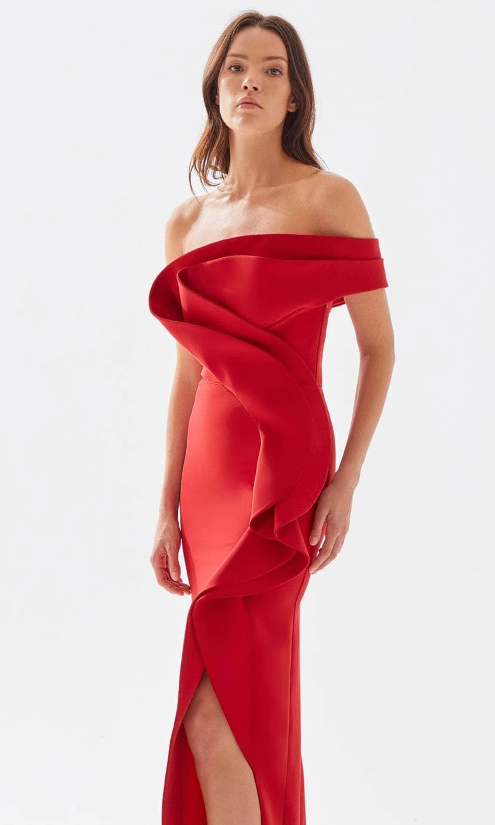 Lavish in the exceptional beauty of this ultra chic Tarik Ediz 52029 creation on the red carpet. Exceptionally tailored to reveal a luxurious feel with its voluminous ruffled design, this piece flaunts an asymmetrical bodice with an off shoulder short sleeve. Styled with a drape paneled back, the cascading ruffle accent trims the sexy slit. The sheath skirt sculpts and streams into a floor grazing hemline. Glow with an immaculate elegance in this exquisite Tarik Ediz masterpiece. Models are wearing the Ivory and Red colors.
