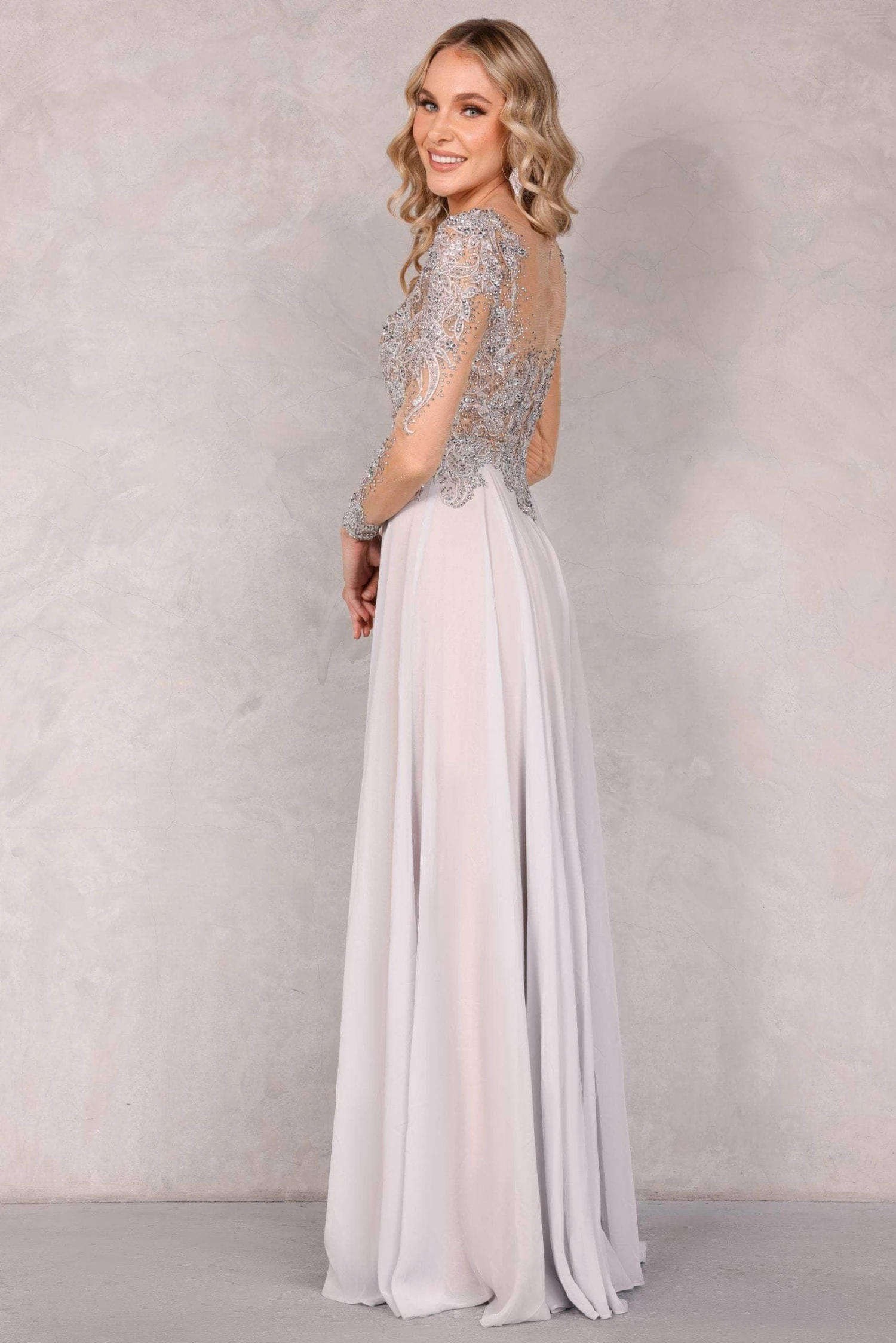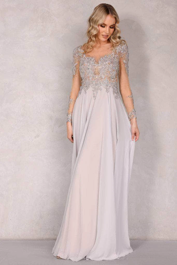 This stunning Terani Couture 1922M0533, exude your lively personality. This long gown is constructed of luxurious Chiffon and beautifully embellished with a sheer long sleeve divinely adorned with special jewels of beads. The scoop neckline and embroidered applique bodice work together to give this dress a charming and sophisticated look. The sheath silhouette flows over the hips and flutters down into a modest train. This elegant dress by Terani Couture would make a luxurious mother of the bride or groom dress, wedding guest dress, or black-tie evening gown. Model is wearing Light Silver color.
